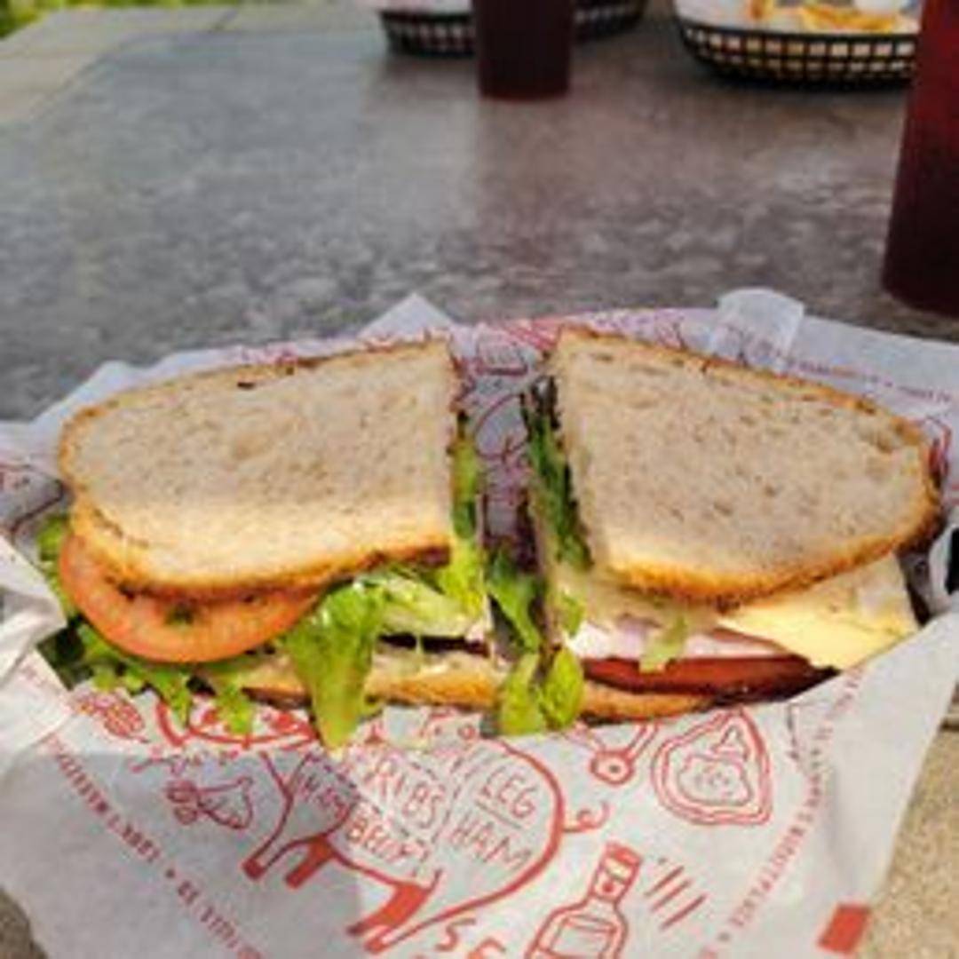 A layered sandwich with turkey, ham, bacon, lettuce, tomato, and mayonnaise on toasted bread. A heartier take on the traditional club.