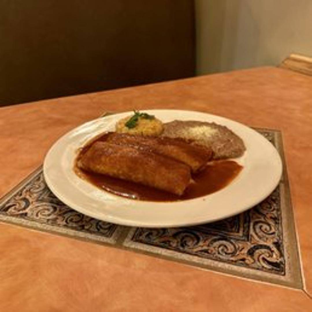 Two corn tortillas filled with a blend of seafood (typically shrimp, crab, and/or fish) and topped with a creamy sauce and melted cheese. Served with rice and beans.