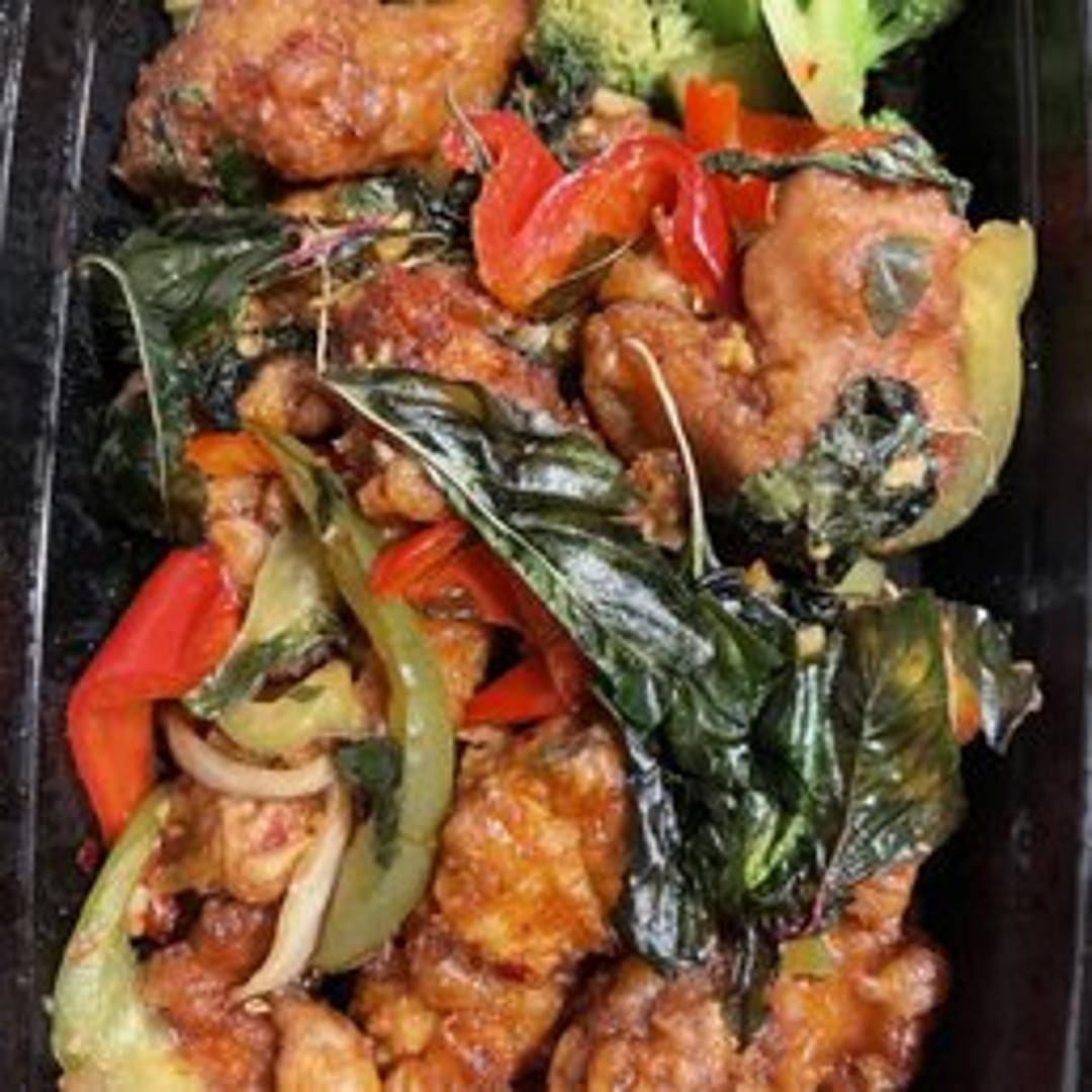 Stir-fried chicken with fresh Thai basil leaves, onions, bell peppers, and chili peppers in a savory sauce. Served hot and fragrant, with a balanced blend of sweet, spicy, and savory flavors.
