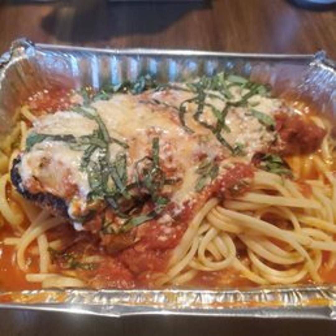 A family-sized portion of breaded chicken breasts topped with marinara sauce and melted mozzarella cheese. Served with a side of pasta.