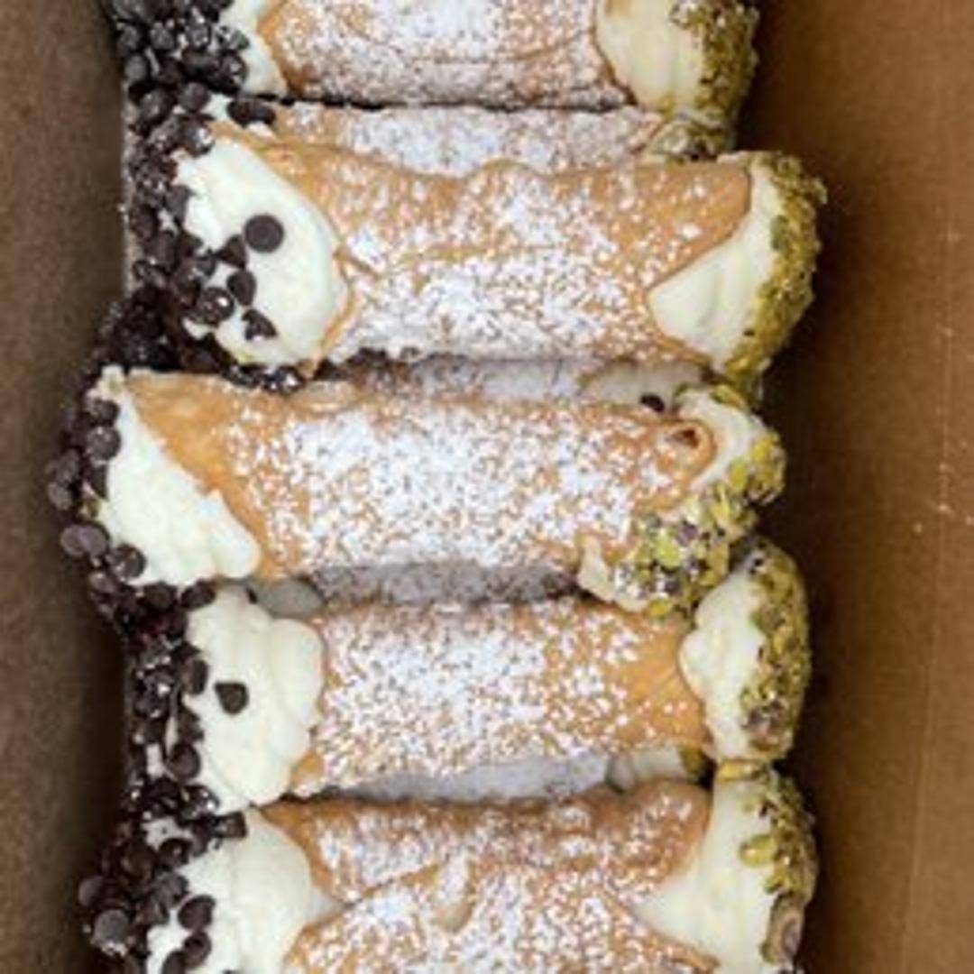 A crispy, tube-shaped shell filled with a sweet, creamy ricotta cheese filling, often studded with chocolate chips or candied fruit, and dusted with powdered sugar.