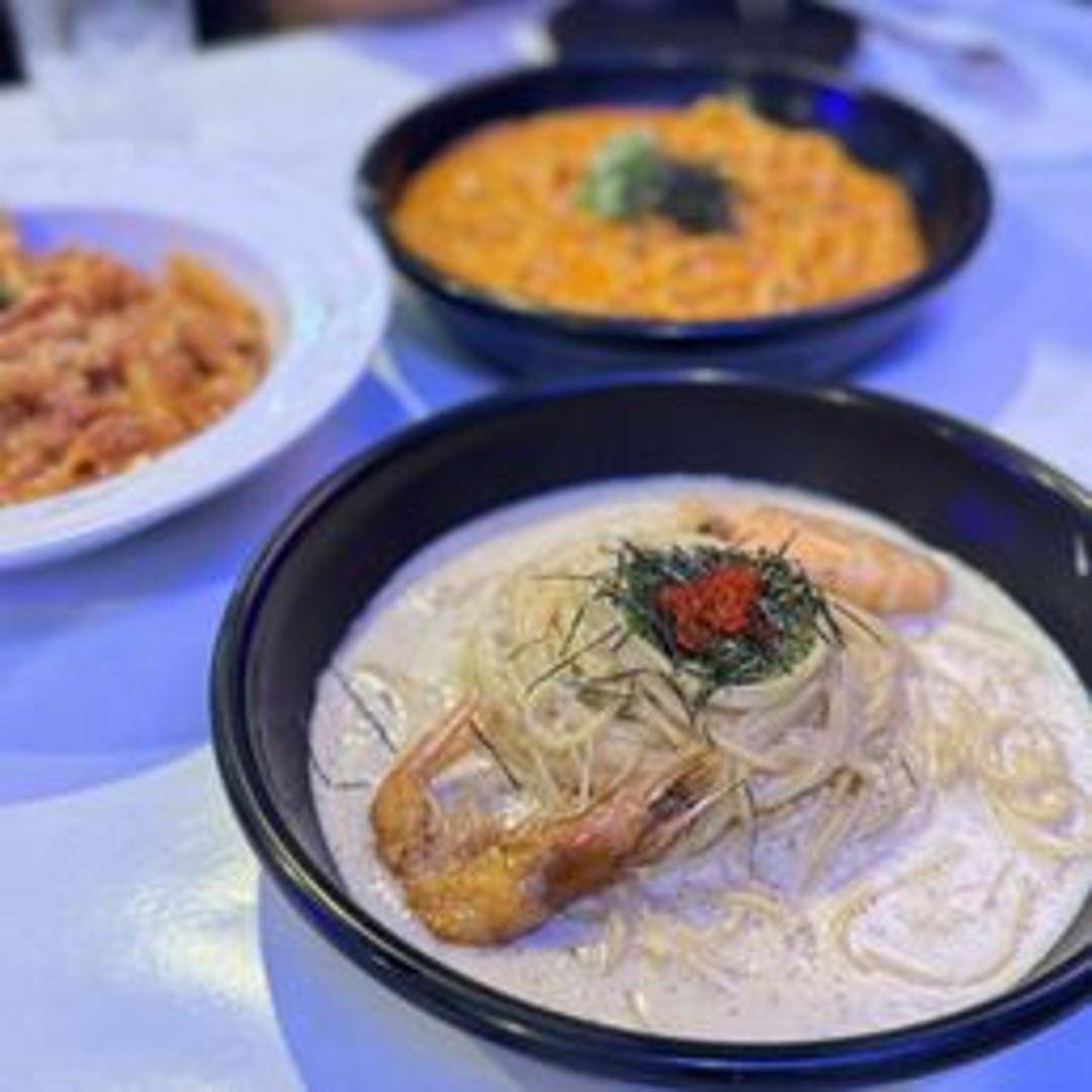 Spaghetti tossed in a creamy and savory mentaiko (spicy pollock roe) sauce. Garnished with nori seaweed.