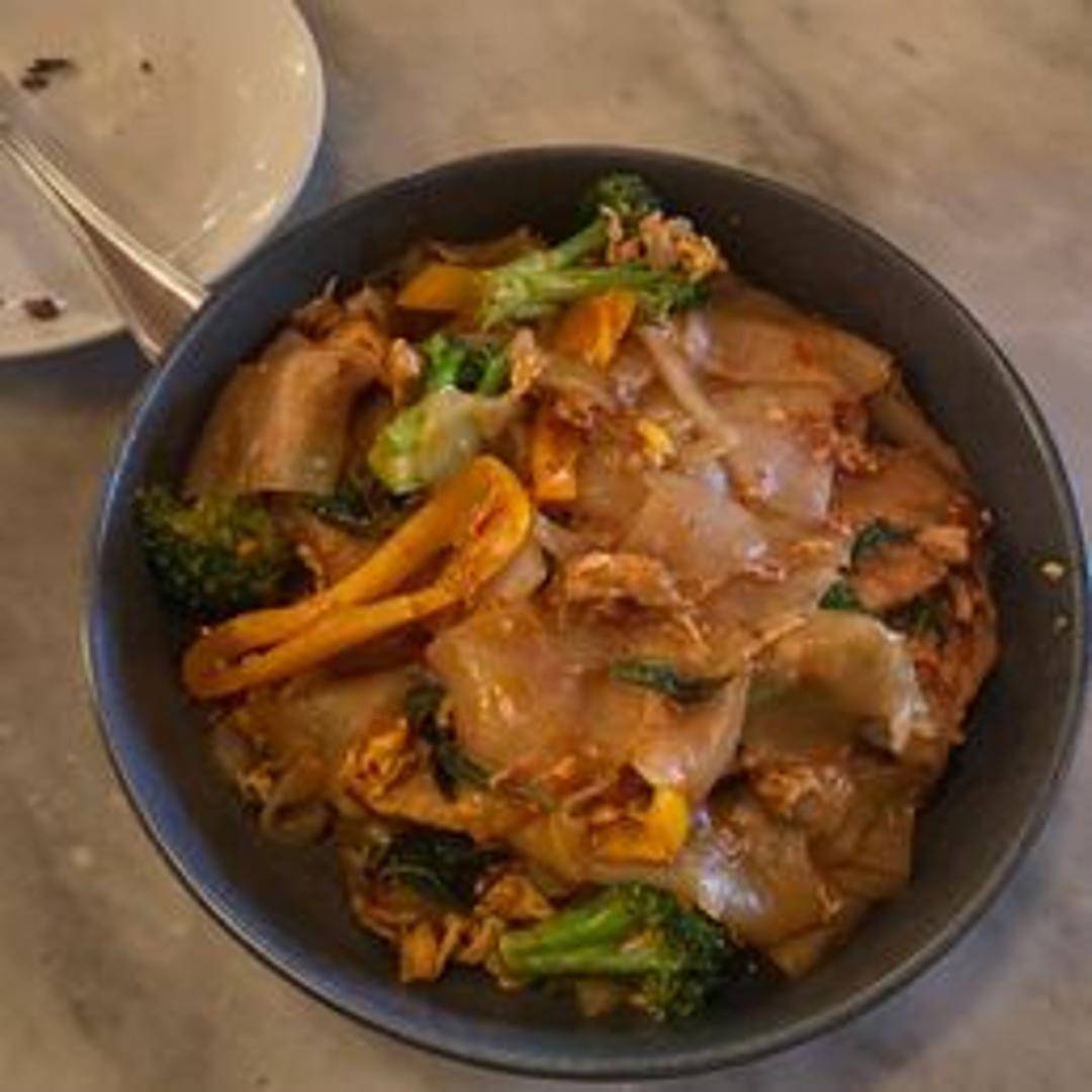 Wide rice noodles stir-fried with a savory and slightly spicy sauce, often featuring ingredients like basil, vegetables, and your choice of protein. The dish is known for its bold flavors and satisfyingly chewy noodles, creating a delightful and comforting meal.