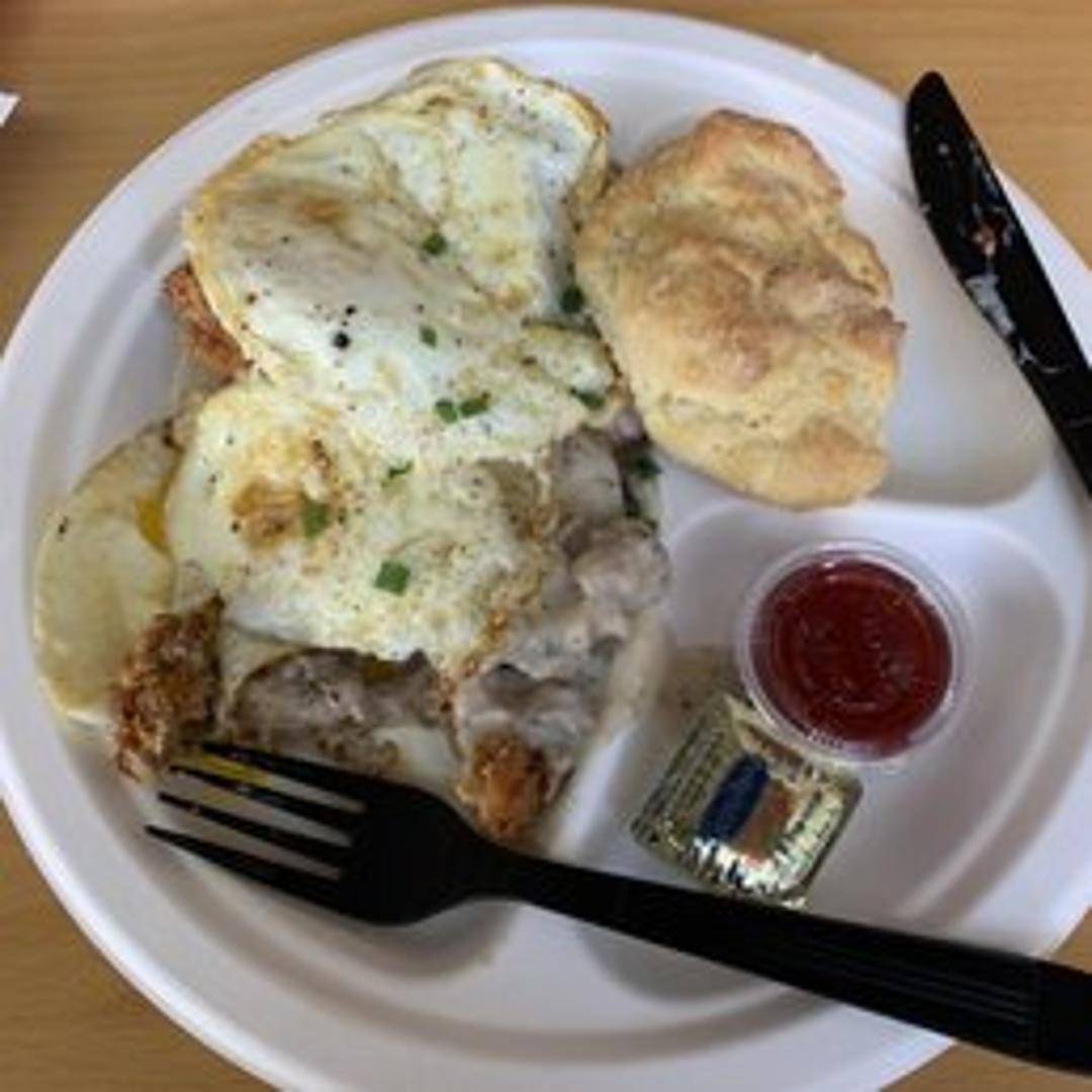 A hearty plate featuring your choice of eggs (scrambled, fried, or over easy), crispy bacon or sausage, creamy grits or hash browns, and a warm buttermilk biscuit with house-made jam.