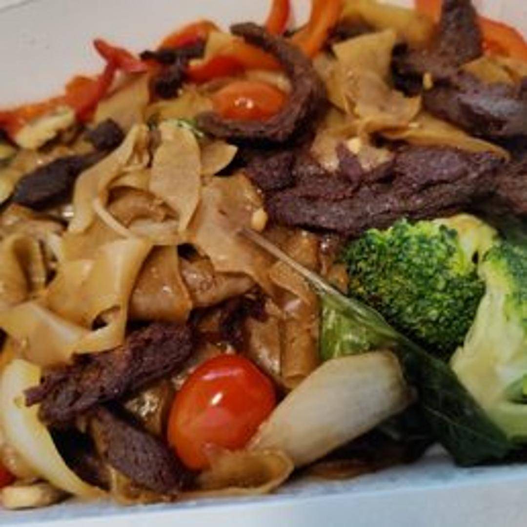 Wide rice noodles stir-fried with vegetables, tofu, and a spicy basil sauce. A bold and flavorful dish that packs a punch.
