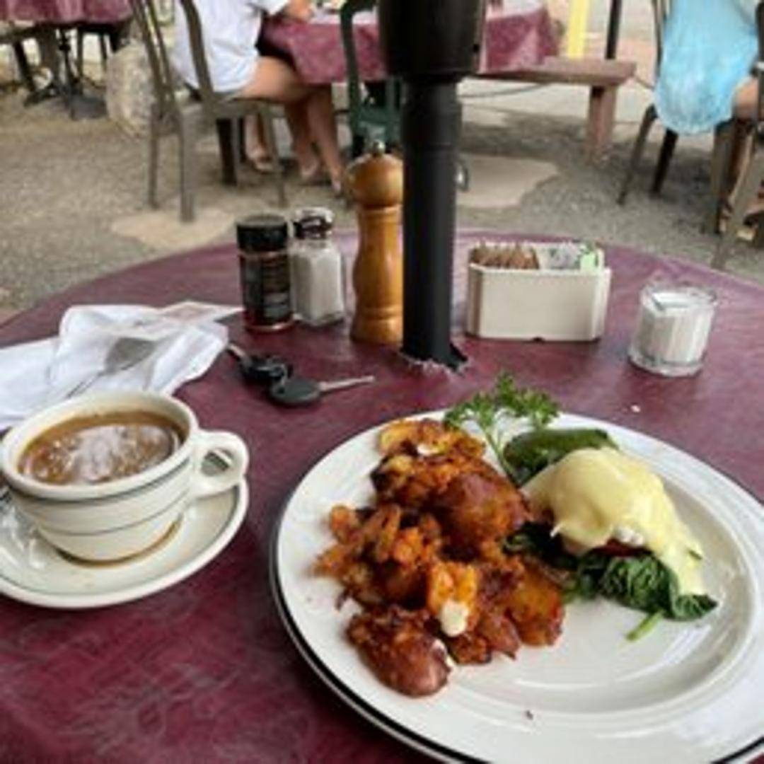 Two poached eggs atop fried green tomatoes and Canadian bacon, smothered in hollandaise sauce.