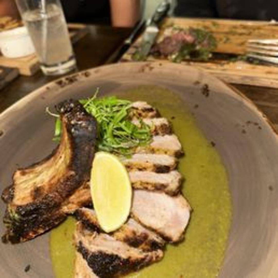 A pork chop marinated in mojo, a citrus-based sauce with garlic, herbs, and spices. Expect a tangy, flavorful, and savory dish.