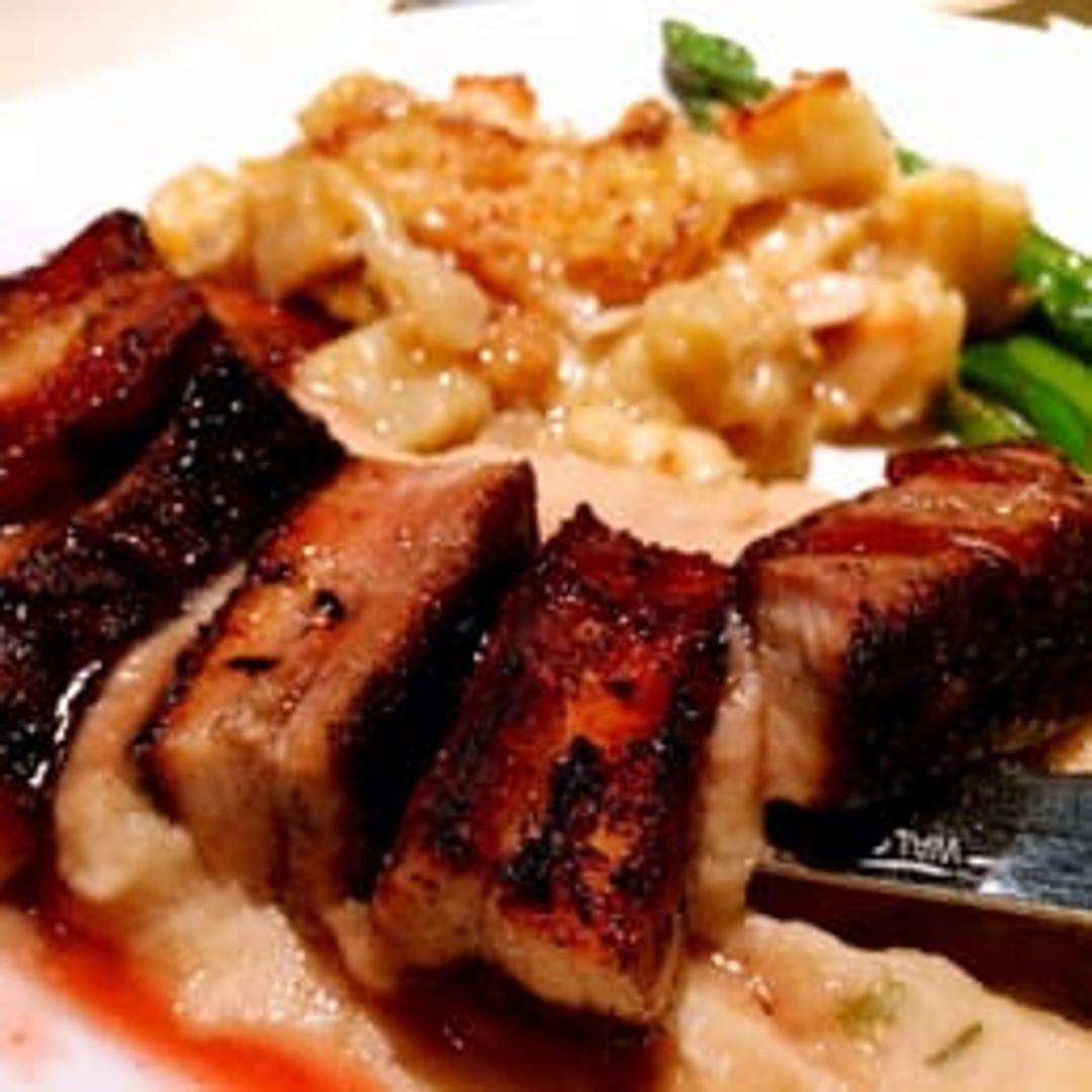 Indulge in our Slow Roasted Pork Belly, a culinary masterpiece featuring succulent cuts of pork belly, meticulously slow-roasted to achieve an incredibly tender, melt-in-your-mouth texture with a savory, caramelized exterior. A rich and flavorful experience.