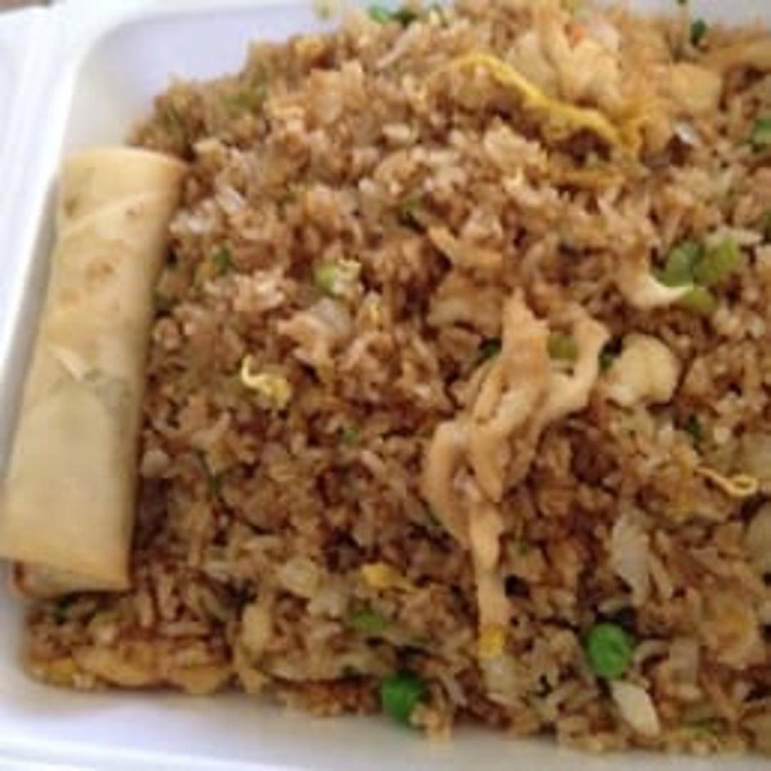 Classic fried rice dish with tender chicken, fluffy rice, scrambled eggs, peas, carrots, and onions, stir-fried in a savory sauce.
