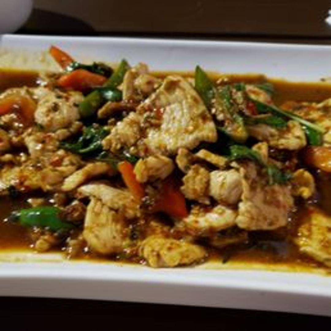 A quintessential Thai stir-fry bursting with flavor. Choose your preferred protein, wok-tossed with fresh Thai basil leaves, crisp bell peppers, green beans, and onions in a savory, spicy chili-garlic sauce. Served with steamed jasmine rice, it's a fragrant and satisfying classic.