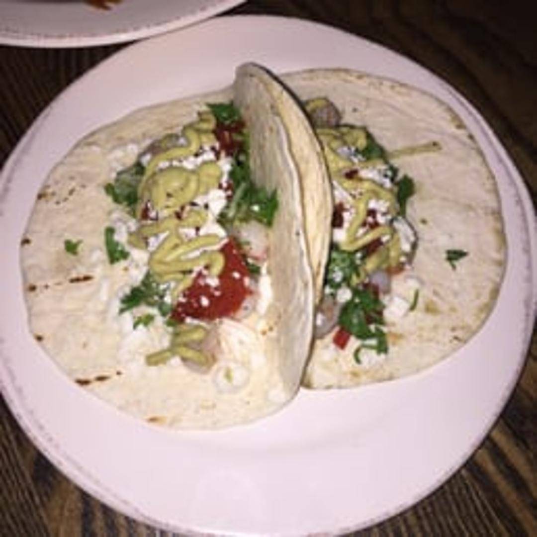 Two soft tacos filled with succulent [insert preparation method here, e.g., grilled or blackened] shrimp. Topped with [insert toppings, e.g., mango salsa, avocado crema, shredded lettuce] and served on warm tortillas.