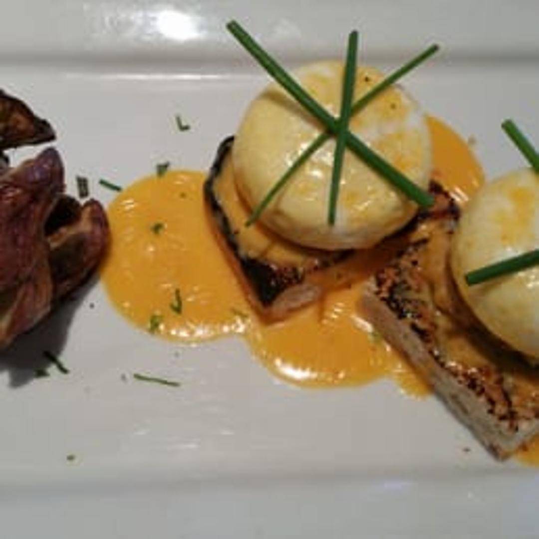 Two pan-seared jumbo lump crab cakes served atop toasted English muffins with poached eggs and creamy hollandaise sauce. Served with a side of breakfast potatoes.