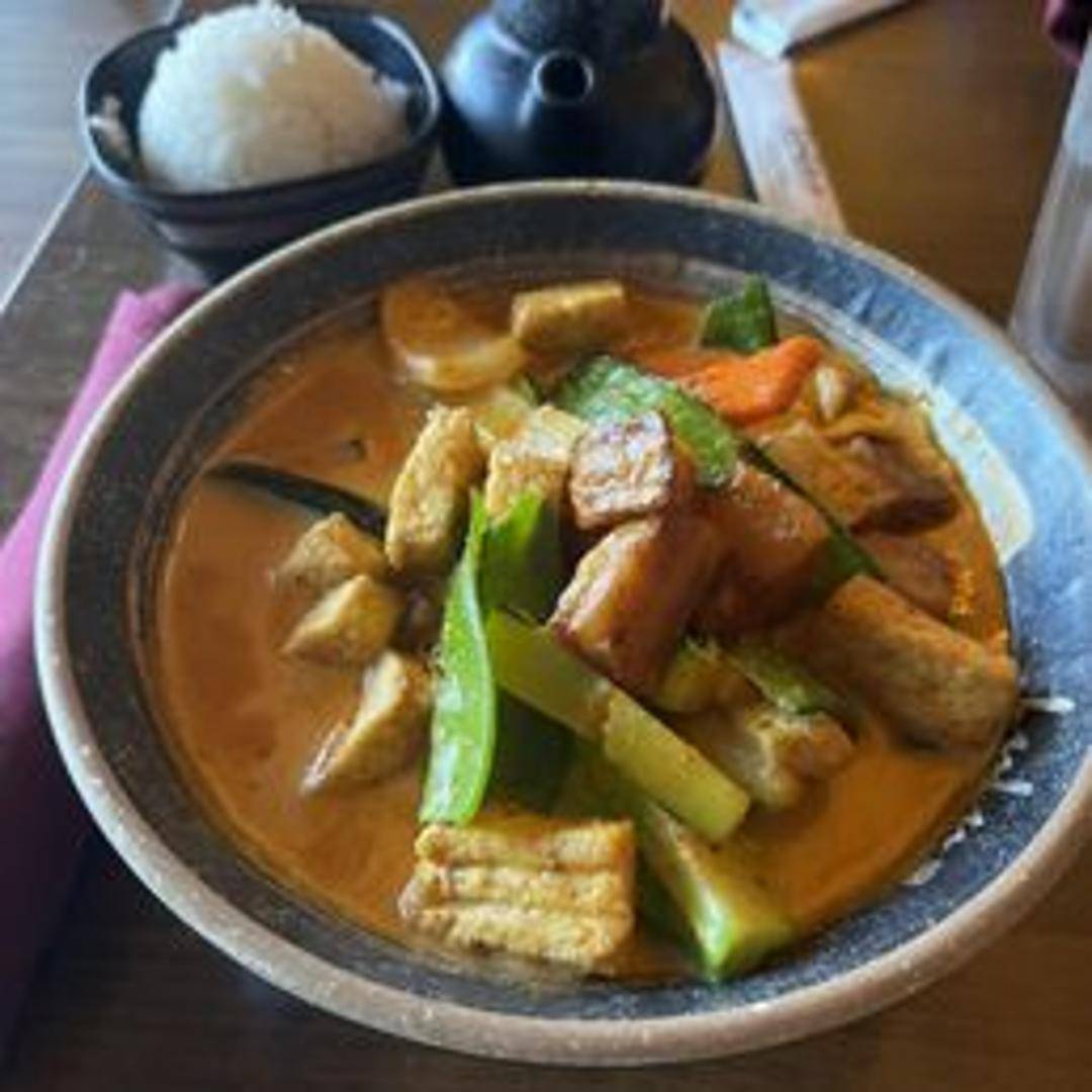 A rich and aromatic curry made with Panang curry paste, coconut milk, bell peppers, green beans, and your choice of protein (chicken, pork, tofu, or shrimp). Garnished with kaffir lime leaves and served with steamed rice.