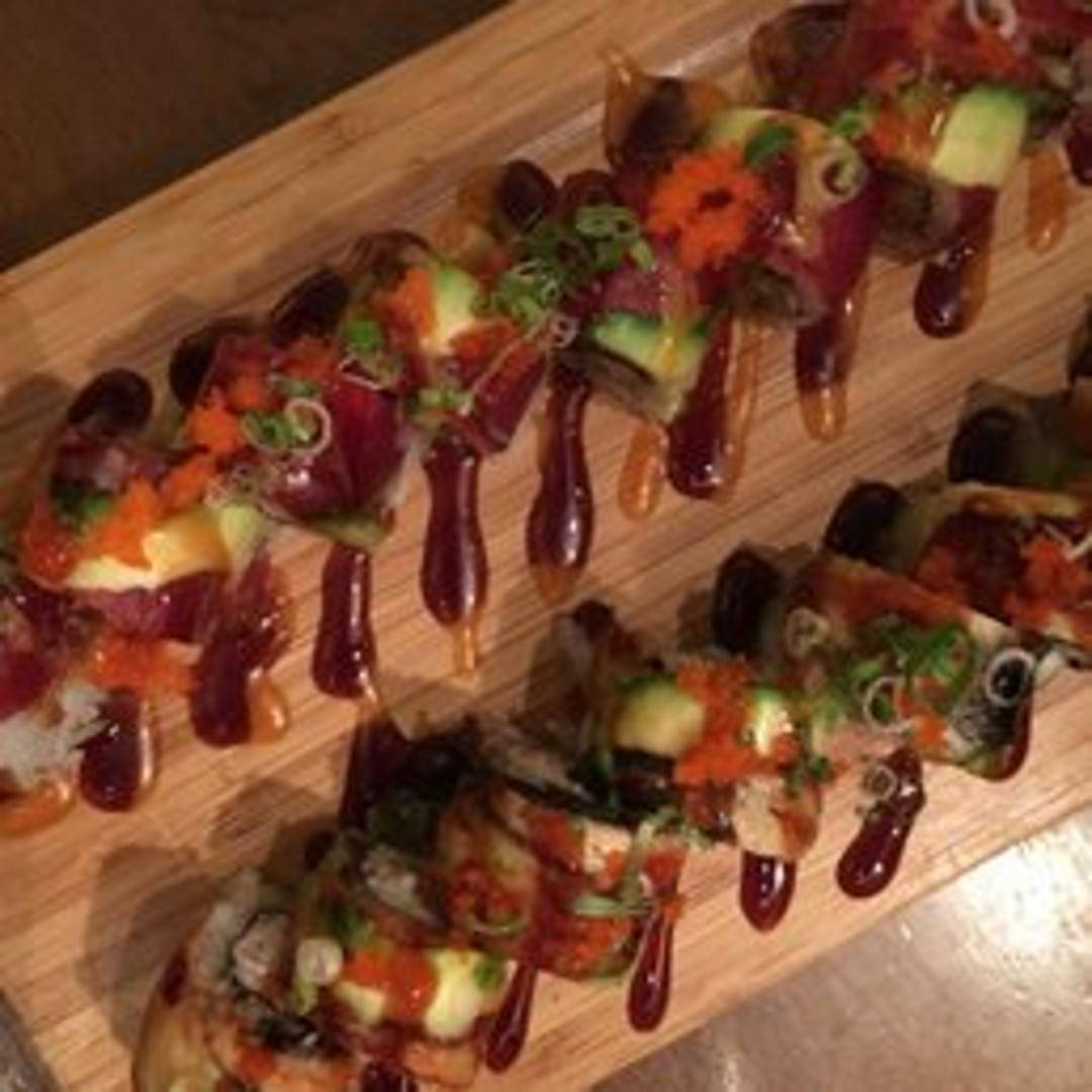 A special sushi roll featuring tempura shrimp, avocado, cucumber, and spicy mayo, topped with seared tuna, eel sauce, and masago.