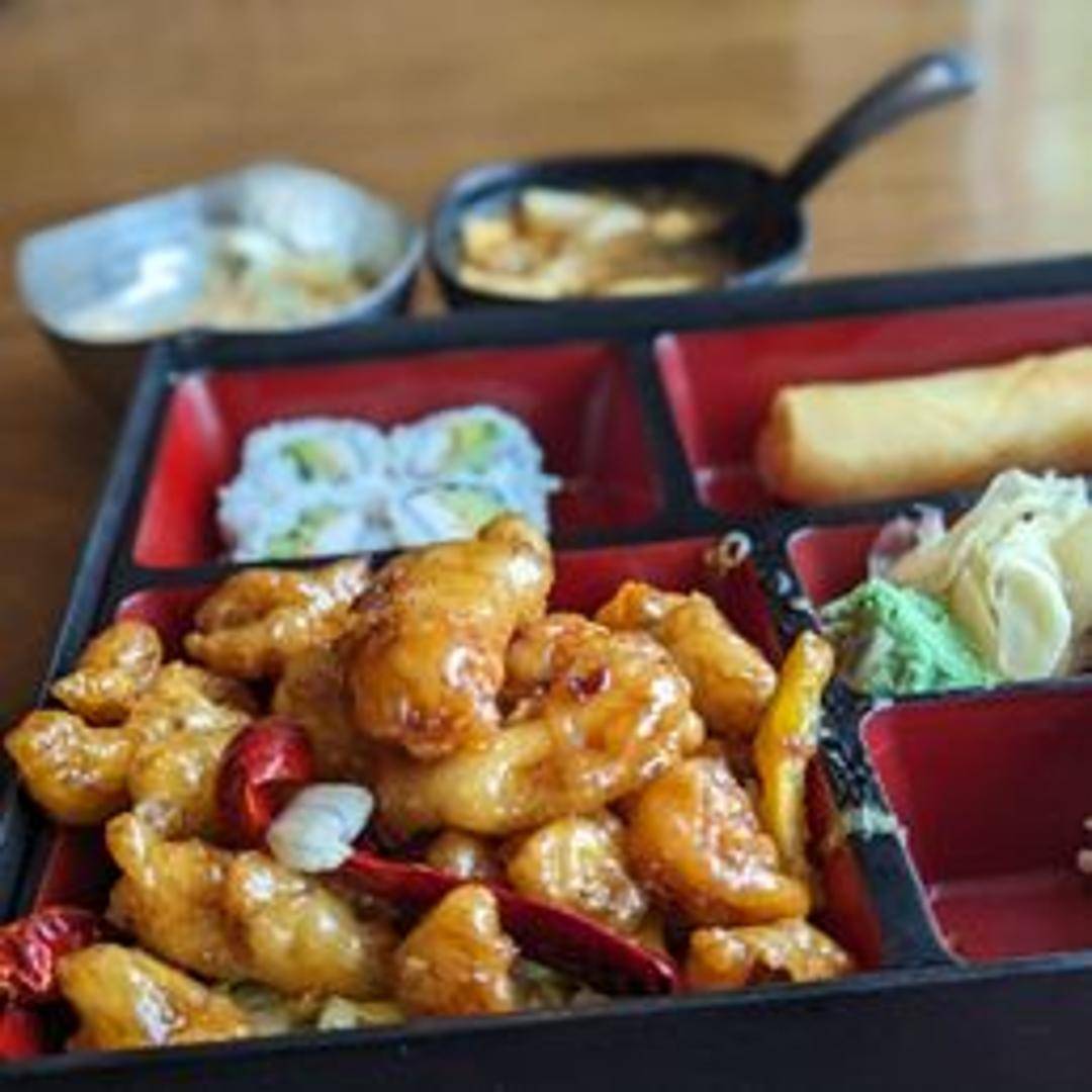 Crispy, battered chicken coated in a tangy and sweet orange-flavored sauce. Served with a side of rice.