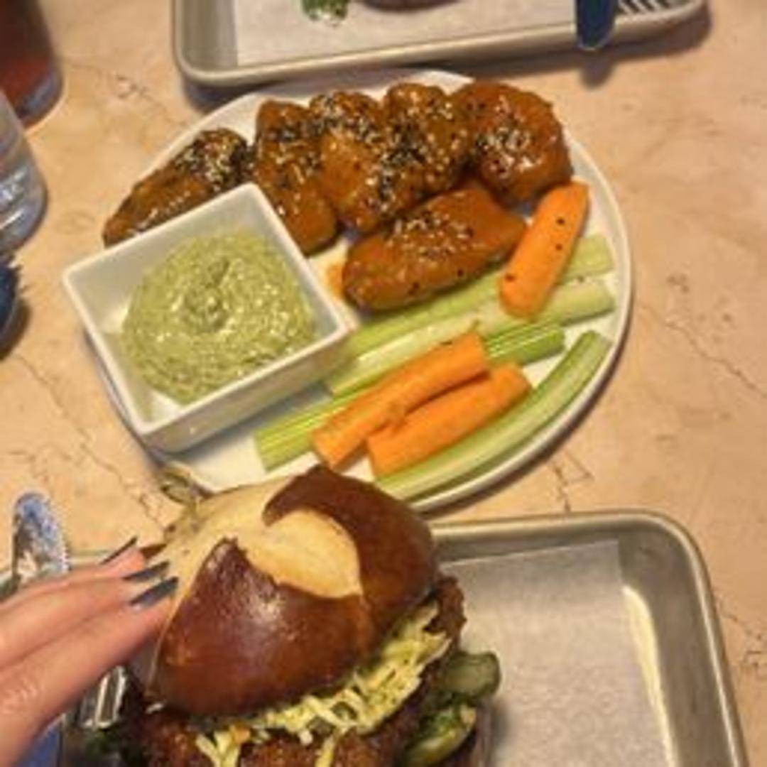 A crispy plant-based chick'n patty drizzled with hot honey, topped with creamy ranch dressing, lettuce, and tomato, served on a toasted bun.