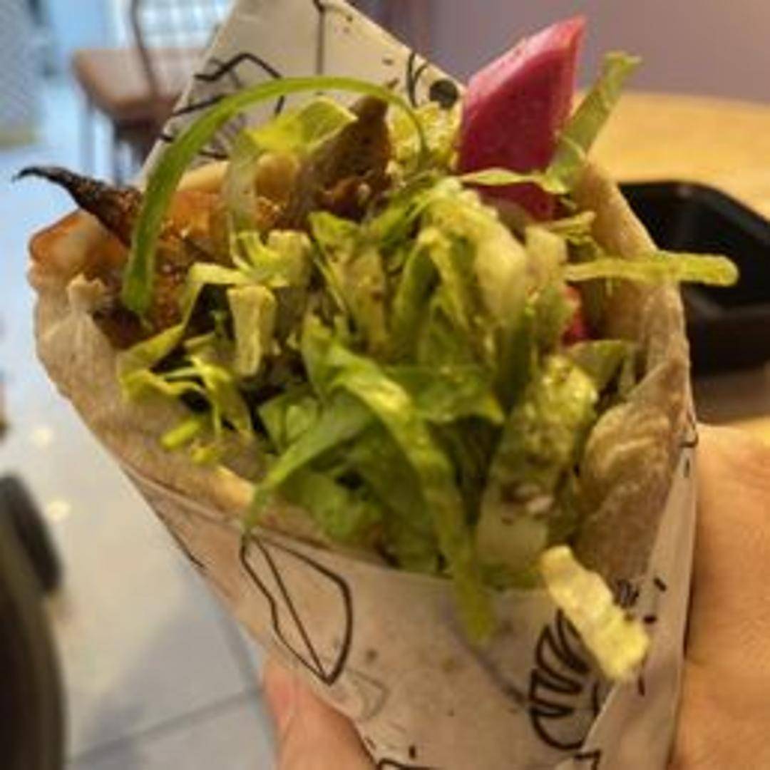 A flavorful and satisfying wrap featuring seasoned and thinly sliced meat (typically chicken or a plant-based alternative), nestled in warm pita bread with fresh vegetables like lettuce, tomatoes, and onions. Drizzled with a tangy tahini or garlic-herb sauce for a complete and delicious meal.