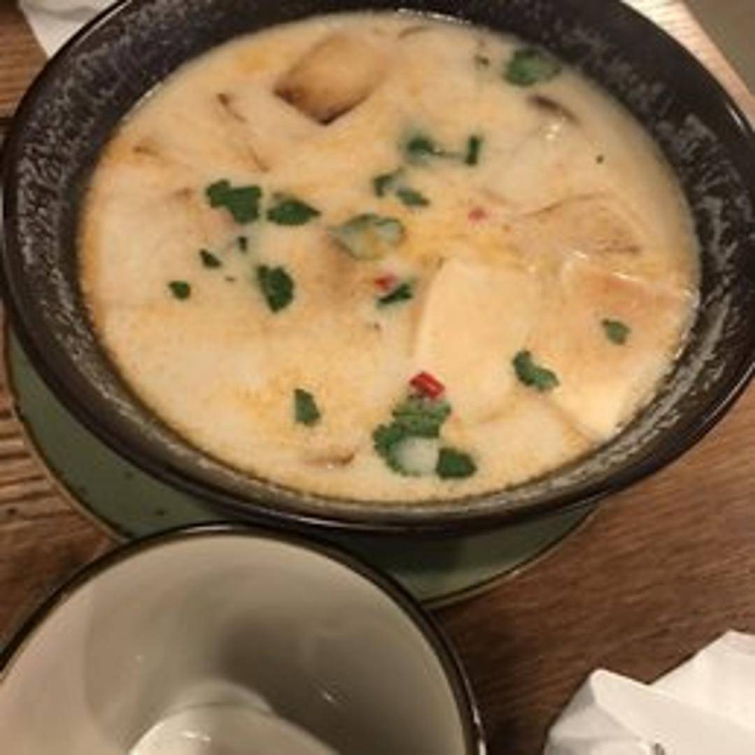 A creamy and fragrant Thai coconut soup with shrimp (Goong), galangal, lemongrass, kaffir lime leaves, mushrooms, tomatoes, and cilantro. A delightful blend of sweet, sour, and savory flavors.