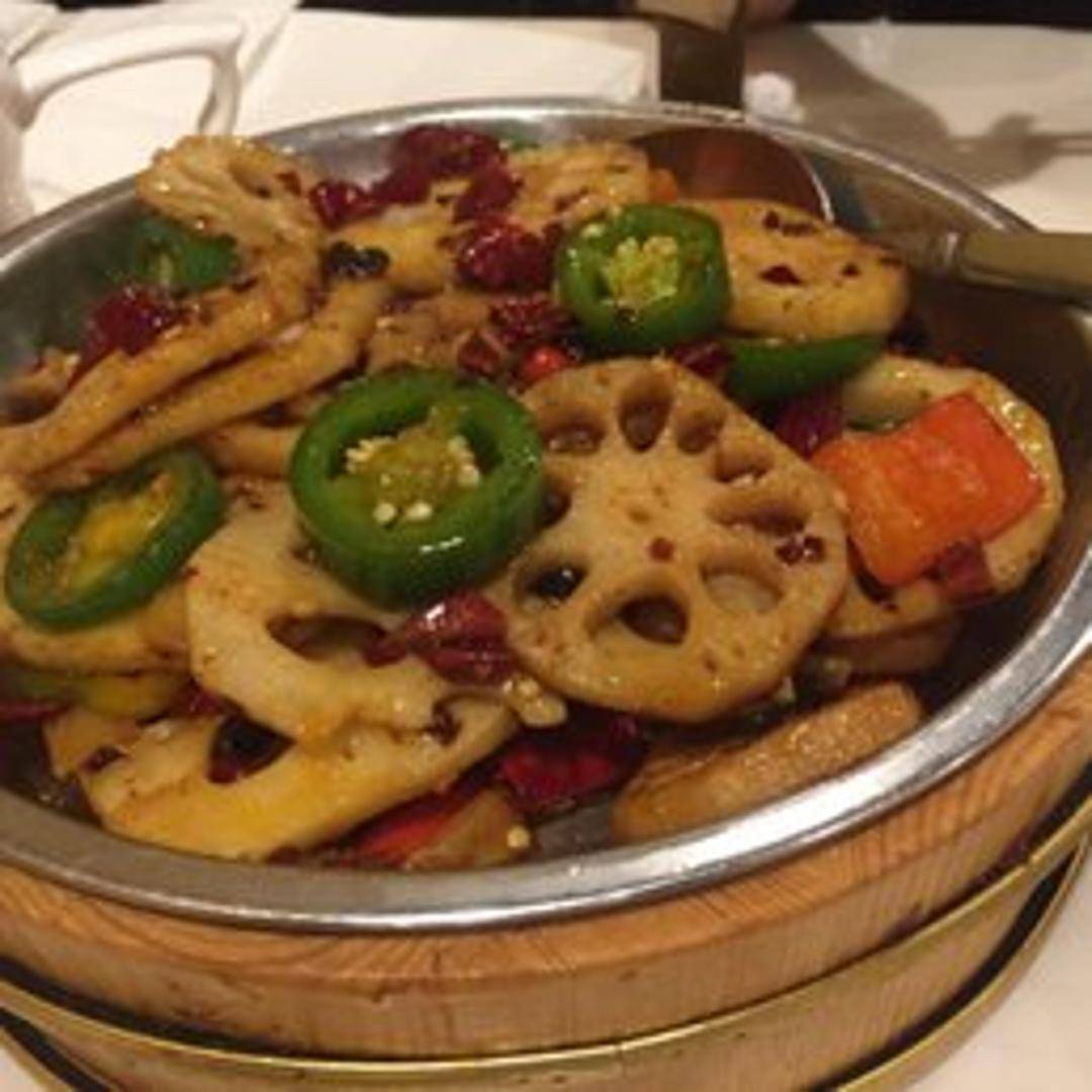 Thinly sliced lotus root stir-fried with your choice of protein (pork, chicken, or tofu) and vegetables in a savory sauce. The lotus root provides a crunchy texture and subtly sweet flavor. Common vegetables include bell peppers, onions, and carrots.