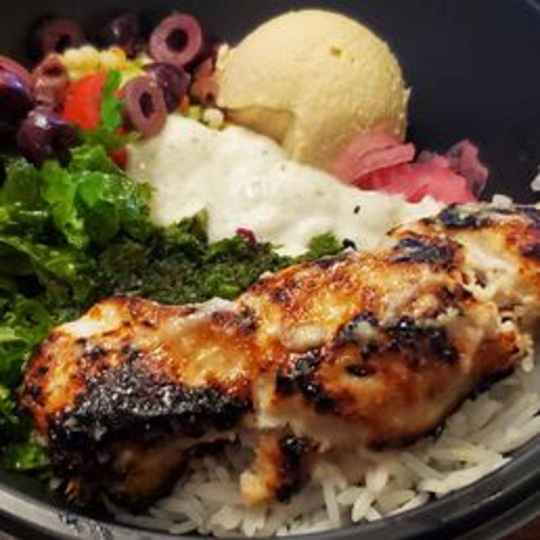 A grain bowl featuring quinoa, grilled vegetables, hummus, feta cheese, and your choice of protein (Gyro meat, Chicken Kabob, or Veggie Kabob). Topped with a lemon vinaigrette.