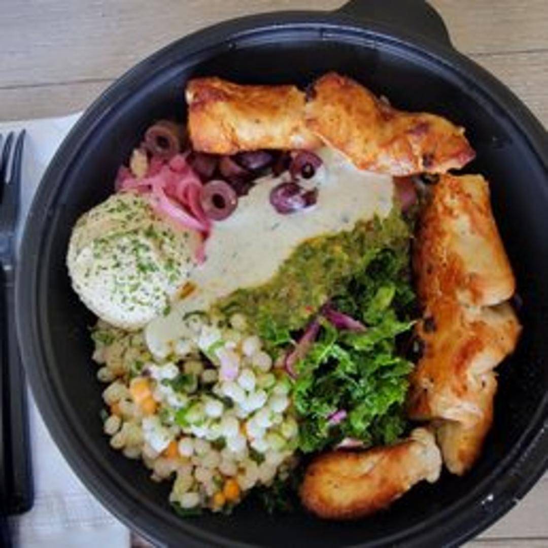 Your choice of protein served over a bed of rice with a Greek salad (tomatoes, cucumbers, onions, feta cheese, olives) and a lemon vinaigrette dressing.