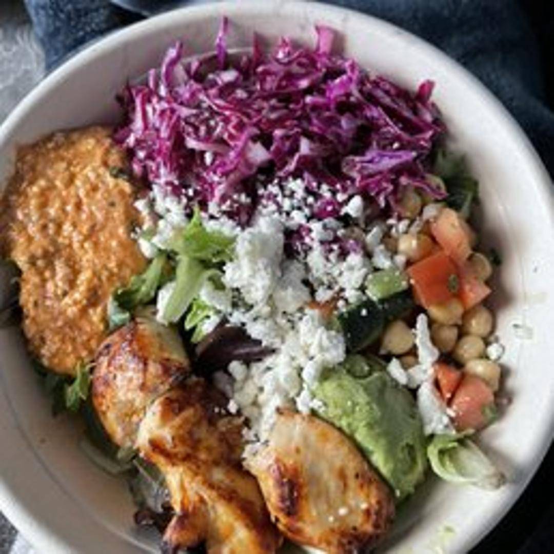 Grilled chicken or gyro meat served over a bed of cauliflower rice, topped with feta cheese, cucumber, tomato, and a drizzle of olive oil and lemon.