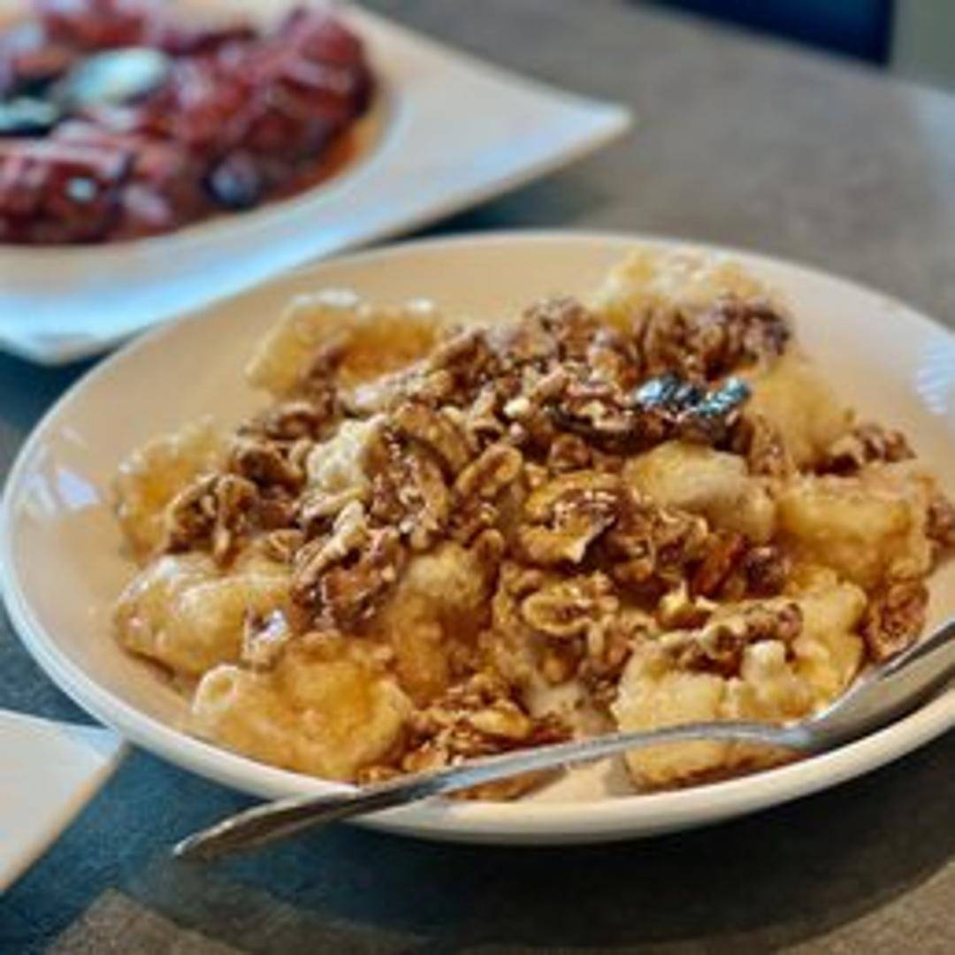 Crispy fried shrimp coated in a sweet and creamy honey sauce, topped with candied walnuts.