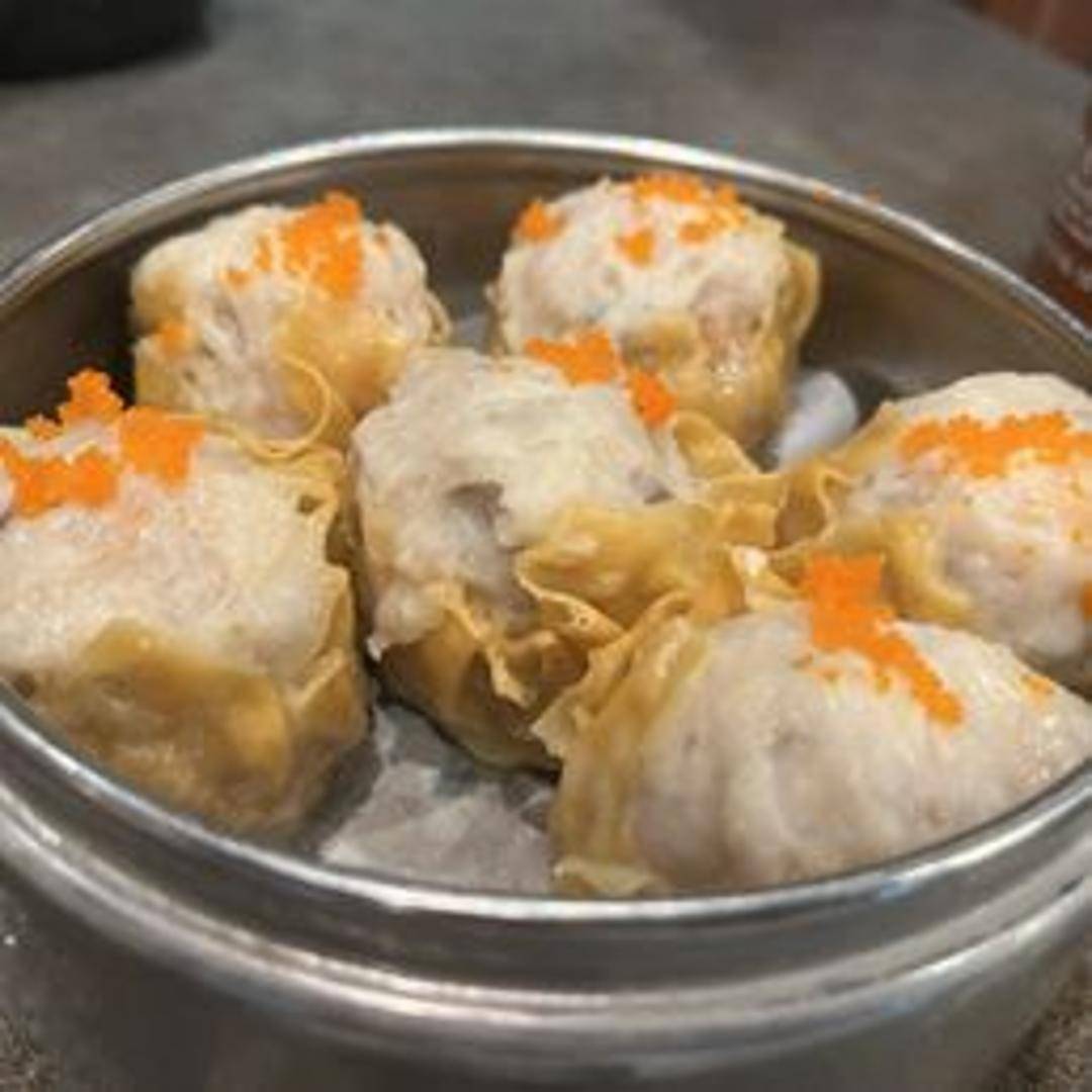 Large, open-topped steamed pork dumpling with shrimp and mushroom.