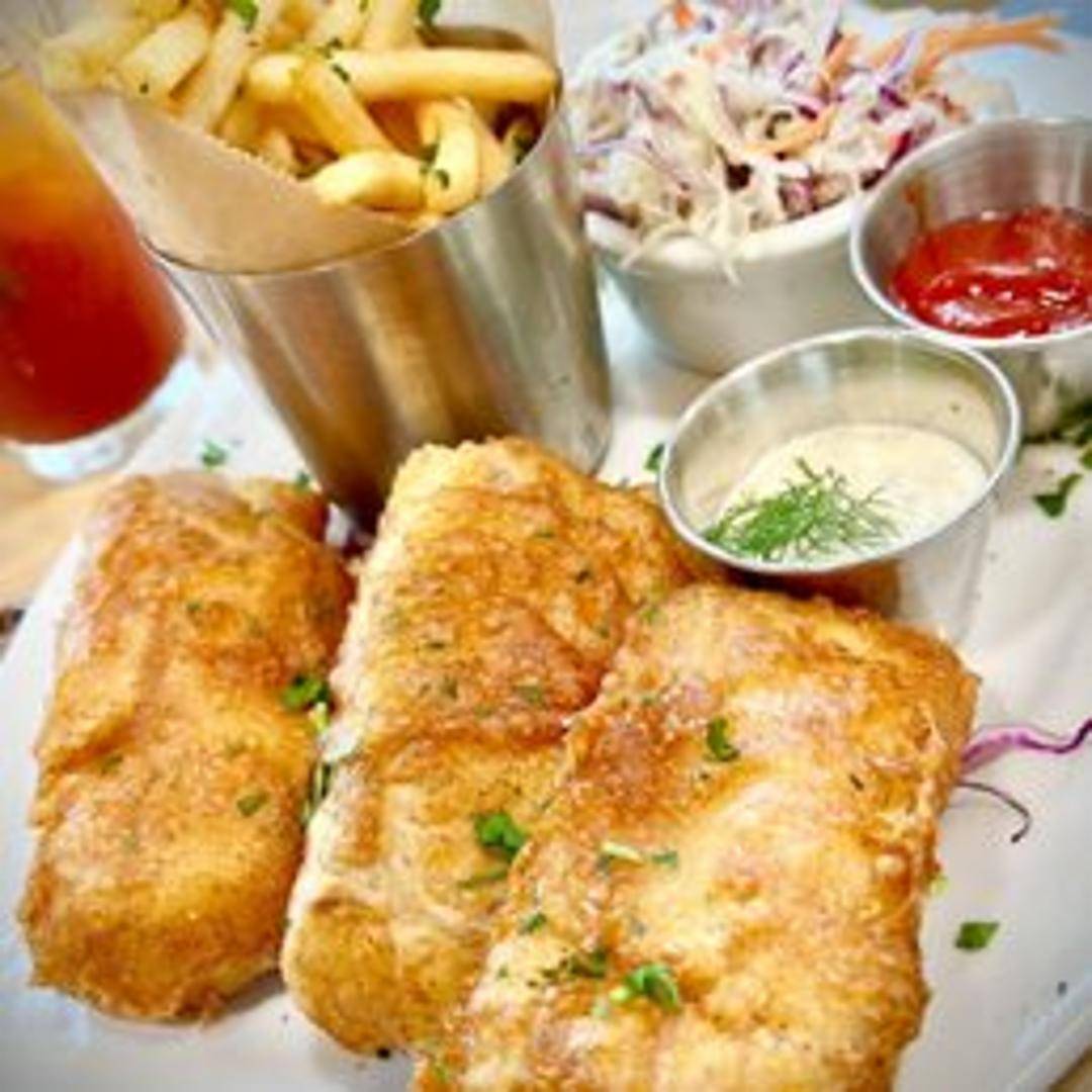 Classic deep-fried fish, typically cod or haddock, served with thick-cut fries. Expect a crispy, golden-brown batter encasing flaky white fish. Served with tartar sauce and often malt vinegar on the side.