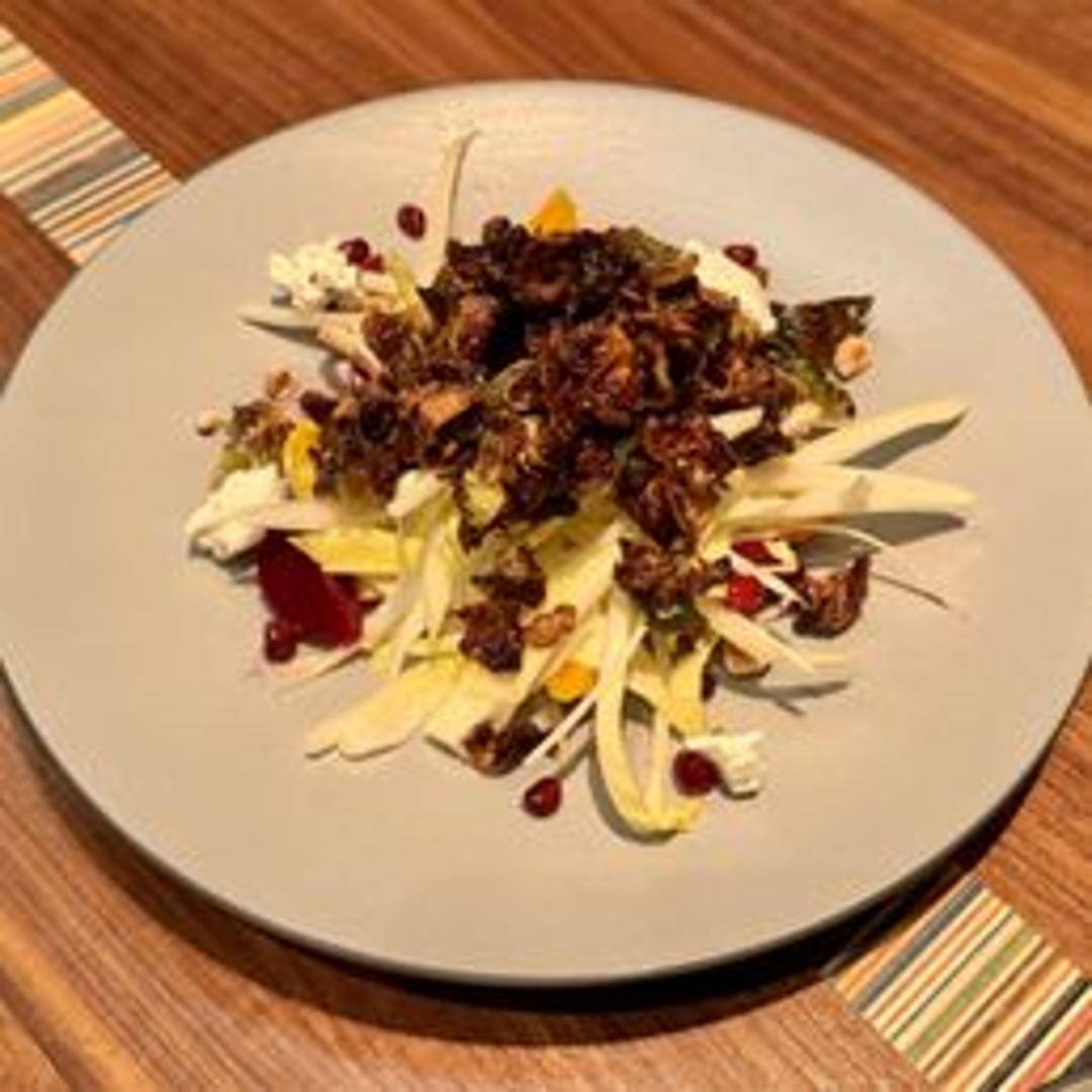 A vibrant salad featuring roasted beets, goat cheese (or alternative), walnuts (or alternative), and a tangy dressing. Contains seasonal ingredients.