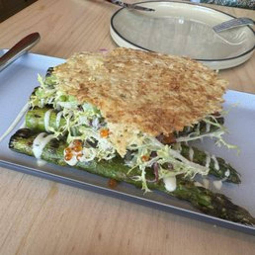 Grilled, locally sourced asparagus spears tossed in a creamy, house-made Caesar dressing featuring anchovies, garlic, Parmesan cheese, and lemon juice. Topped with toasted breadcrumbs and shaved Parmesan.