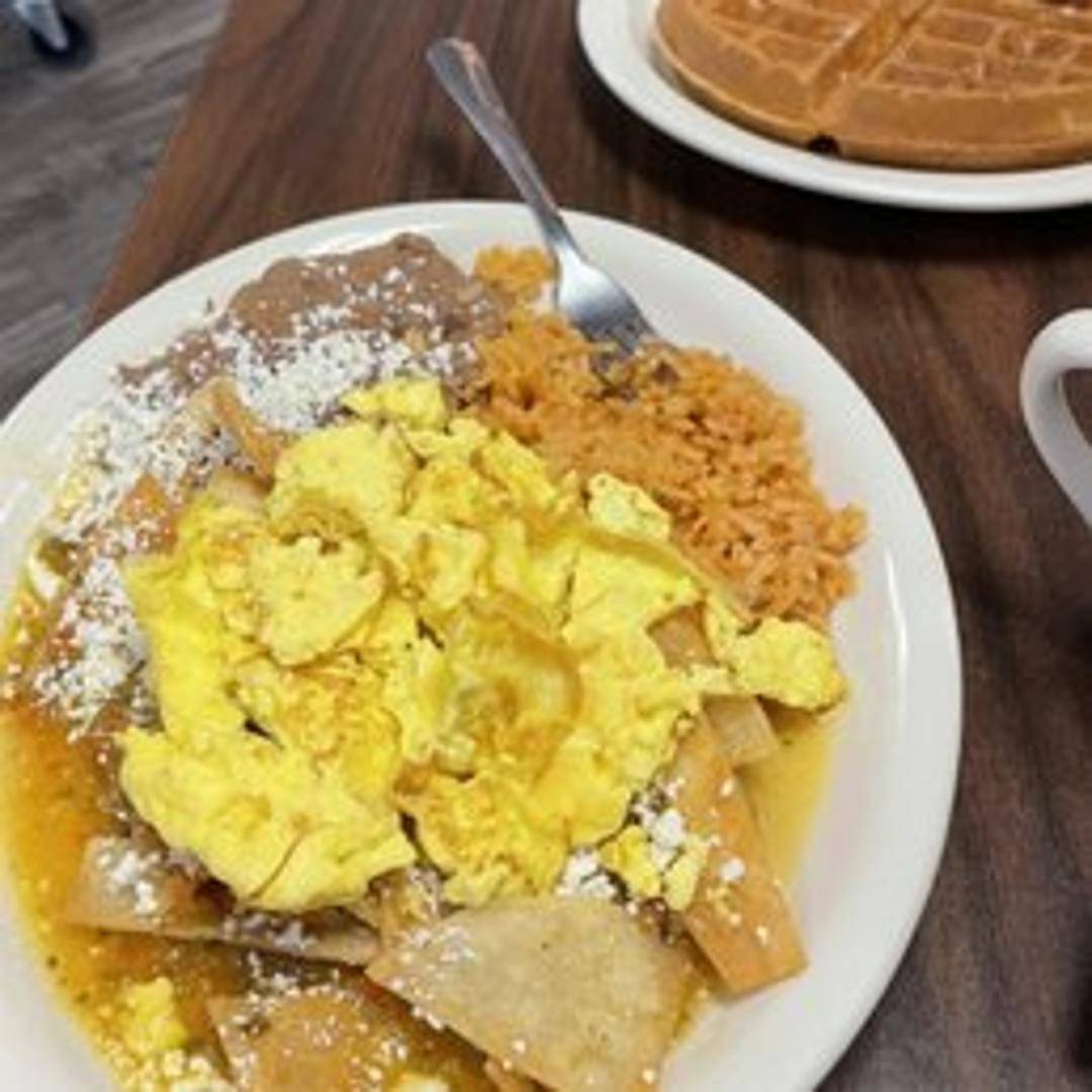 Crispy tortilla chips simmered in your choice of red or green salsa, topped with queso fresco, onions, and sour cream. Served with rice and beans.
