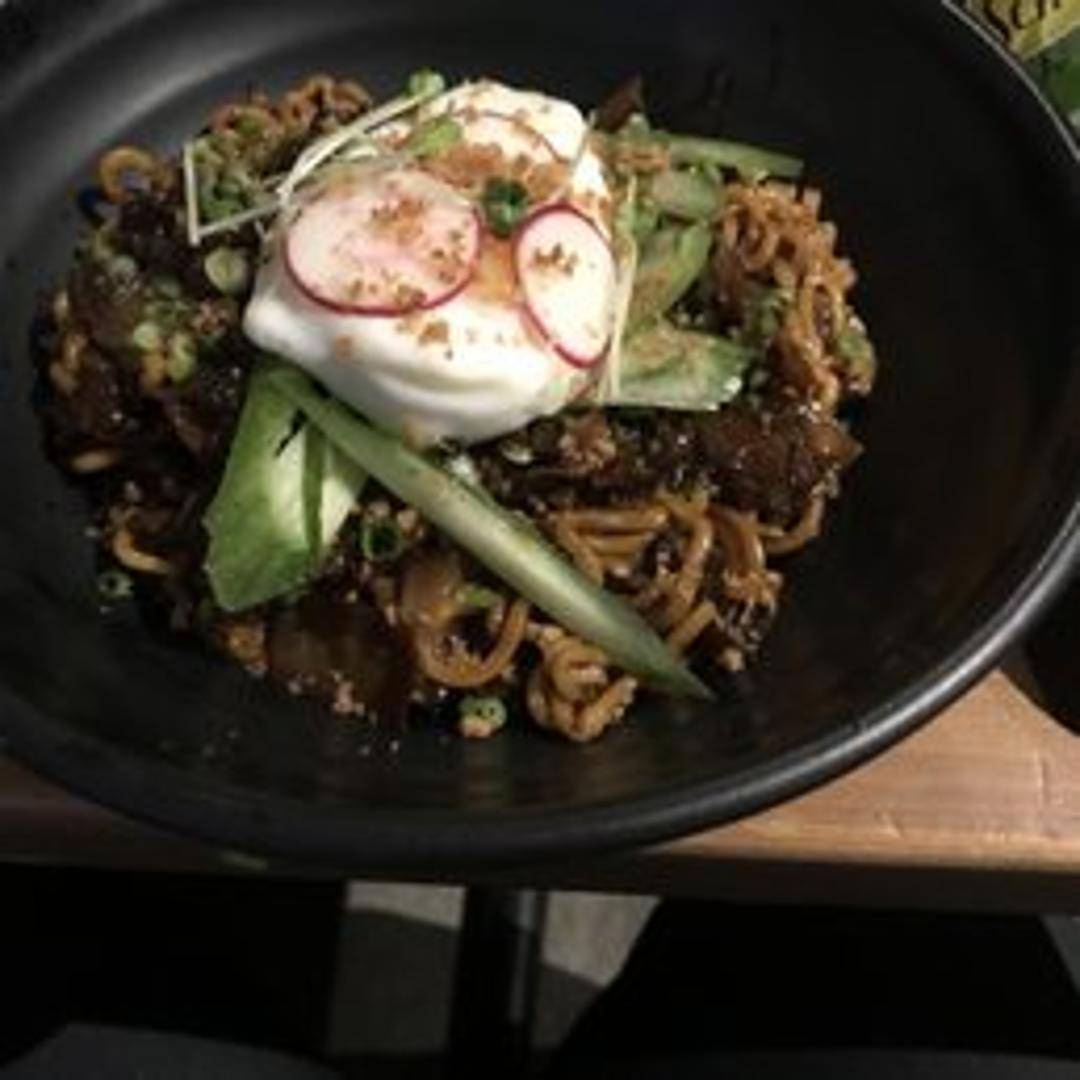 Korean-Chinese noodle dish featuring thick, chewy noodles smothered in a savory black bean sauce. The sauce is made from fermented black soybeans, diced vegetables, and sometimes small pieces of meat, creating a rich and slightly sweet flavor. Often garnished with sliced cucumber.