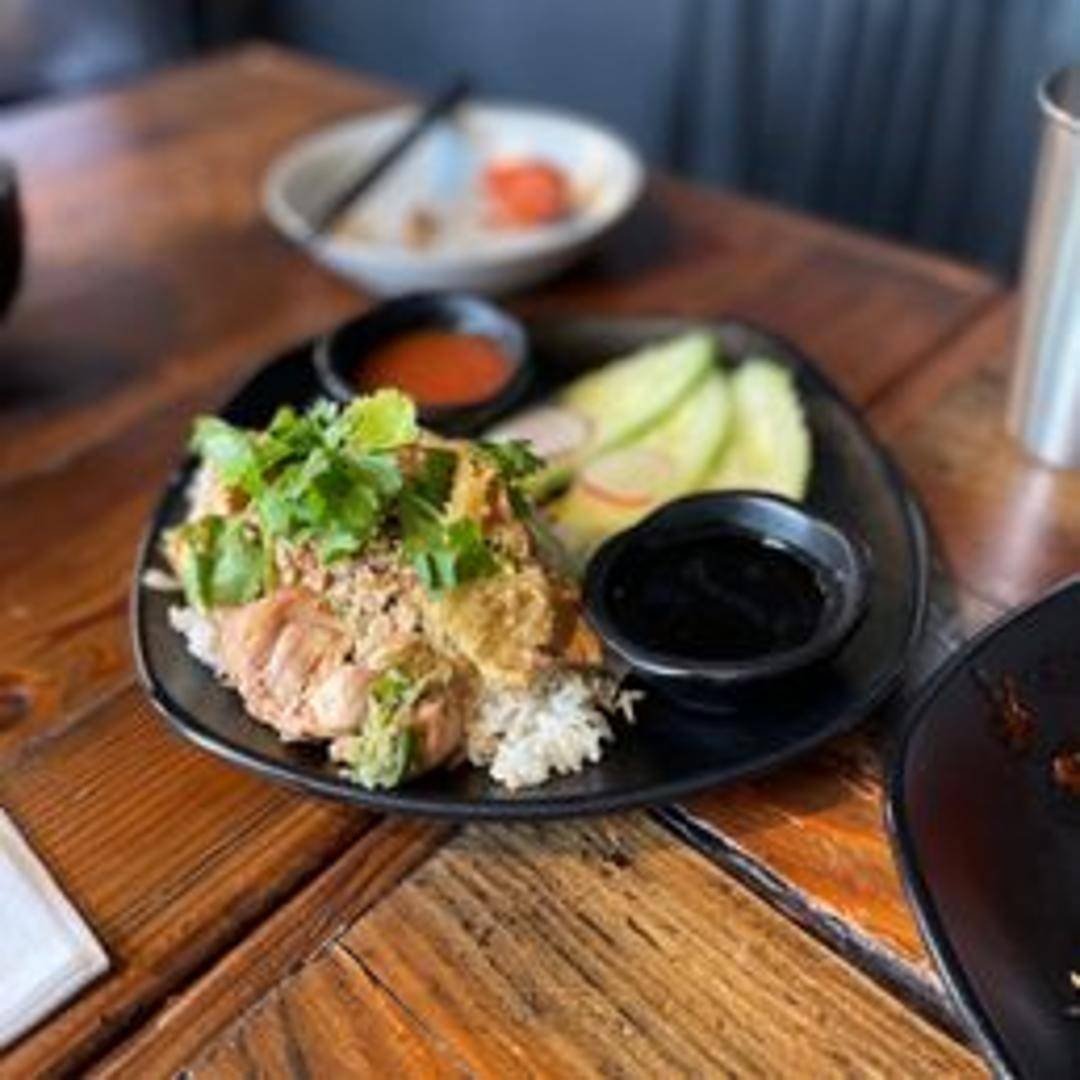 Tender, poached chicken served with fragrant rice cooked in chicken broth and ginger. Accompanied by a flavorful ginger-scallion sauce and a dark soy dipping sauce.