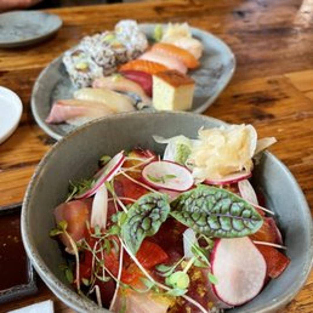 A traditional and vibrant Japanese dish featuring a generous and artful arrangement of premium sashimi-grade fish, such as tuna, salmon, yellowtail, and whitefish, elegantly presented over a bed of perfectly seasoned sushi rice. Typically garnished with a colorful assortment of fresh roe, pickled ginger, shiso leaf, and finely sliced vegetables, offering a fresh, diverse, and visually stunning culinary experience.