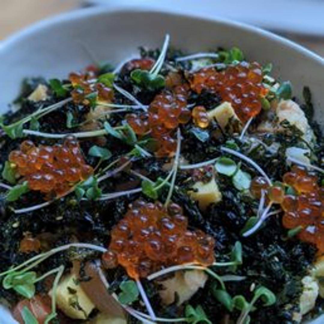 A scattered sushi bowl featuring a vibrant assortment of finely diced, fresh sashimi (typically tuna, salmon, yellowtail, and other seasonal fish), marinated shiitake mushrooms, cucumber, ginger, and seaweed salad, artfully arranged over a bed of seasoned sushi rice. A delightful and refreshing combination of textures and flavors.