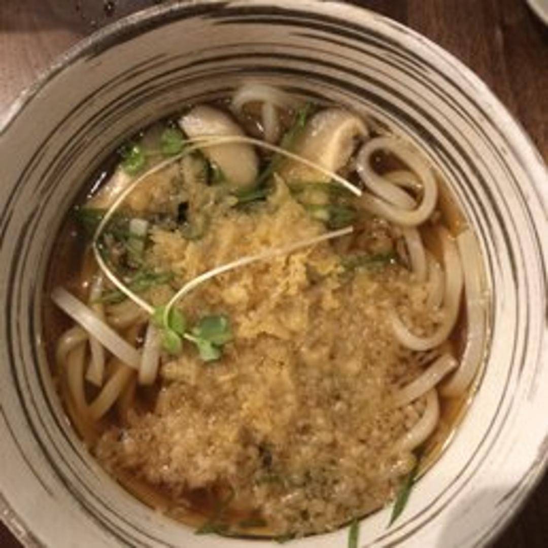 Indulge in a comforting bowl of our traditional Udon Noodle Soup, featuring thick, chewy udon noodles submerged in a savory dashi broth. Garnished with delicate green onions, slices of kamaboko fish cake, and crispy tempura flakes for added texture and flavor.