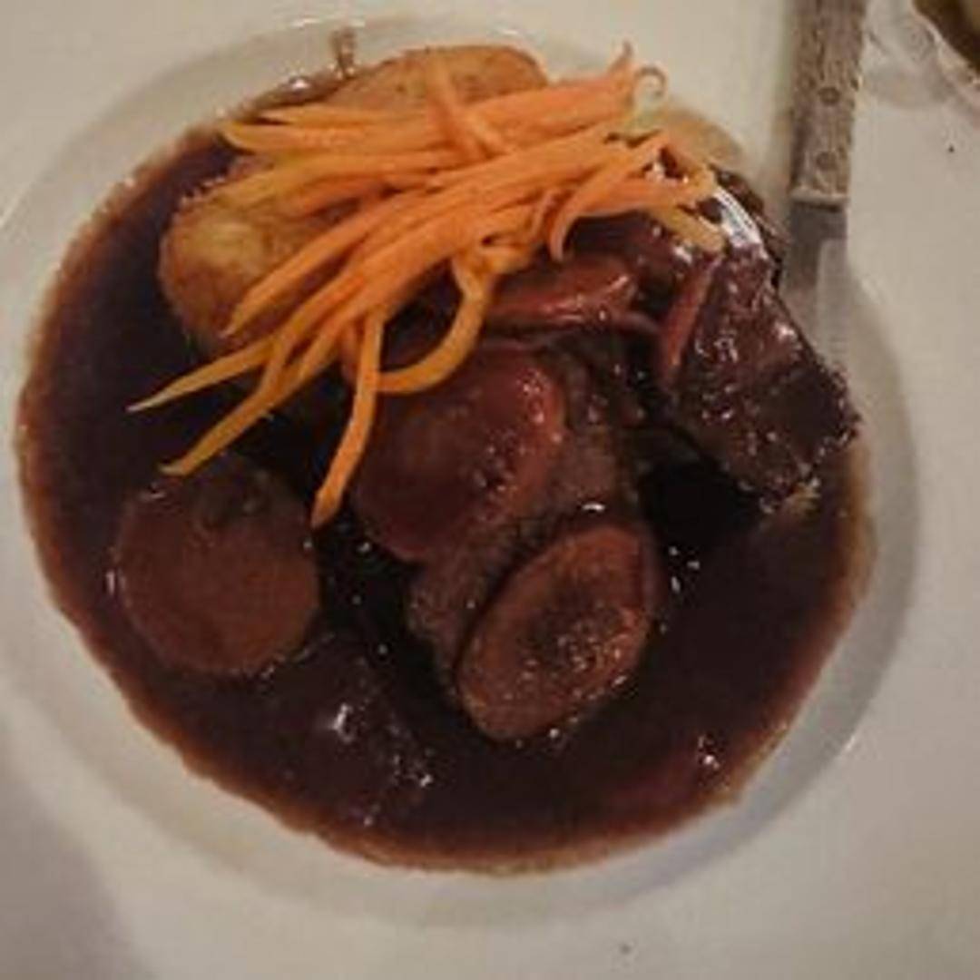 Slow-braised short ribs, fork-tender and flavorful, in a rich jus. Served with seasonal vegetables and creamy polenta.