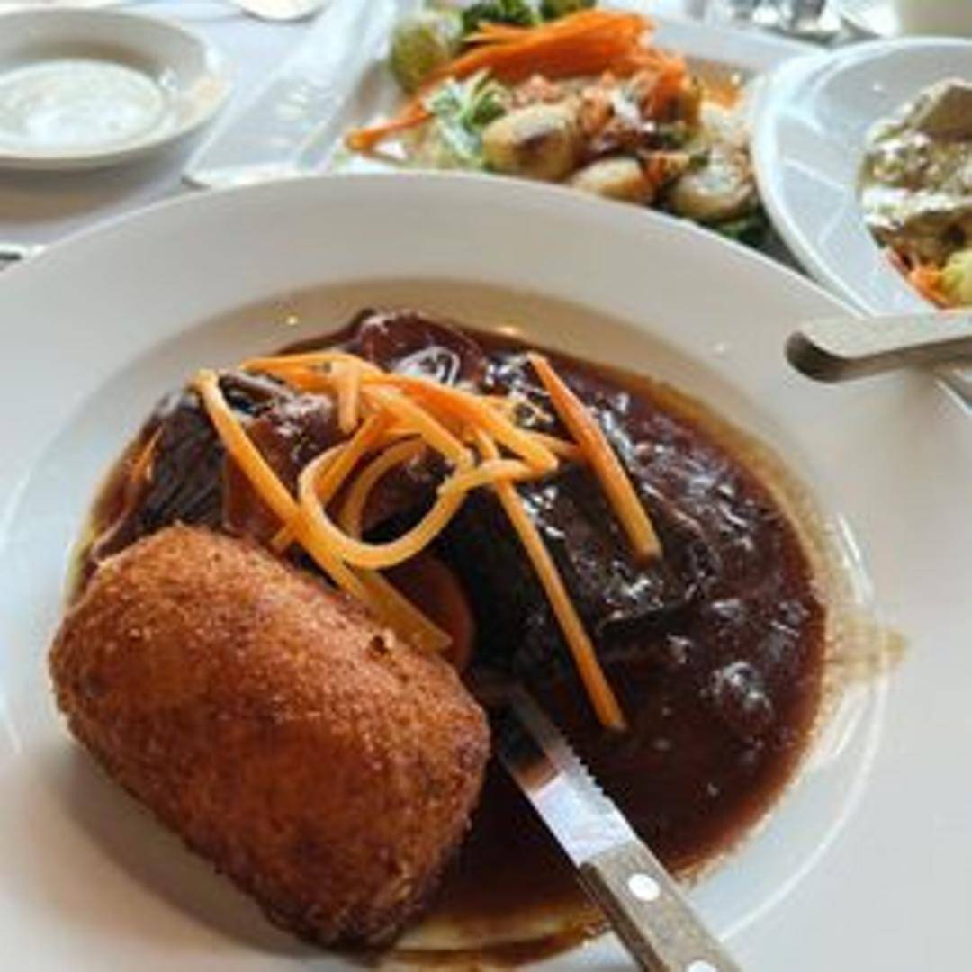 Tender beef braised in red wine with pearl onions, mushrooms, and bacon lardons. Served with creamy mashed potatoes.