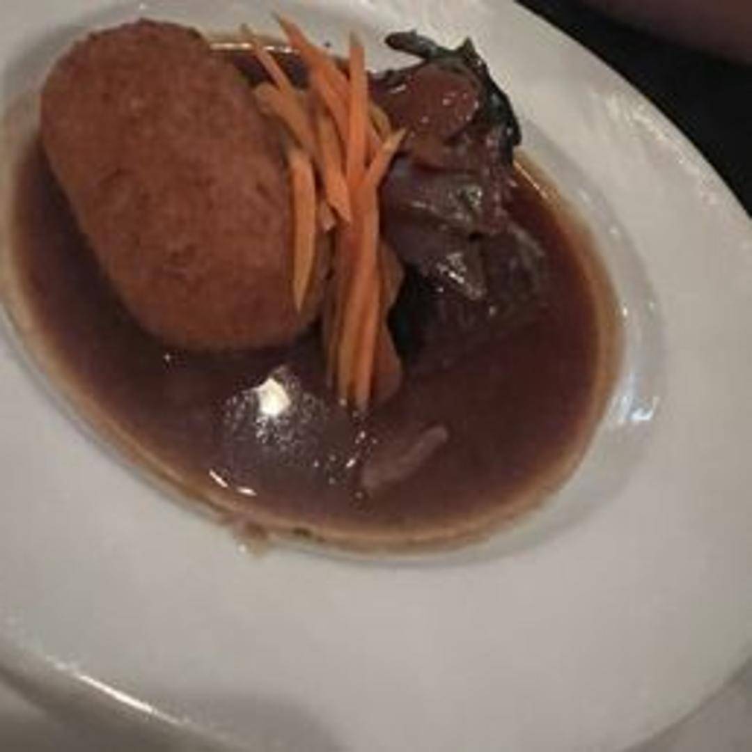 Tender short ribs braised in red wine with pearl onions, mushrooms, and bacon lardons. Served with creamy mashed potatoes.