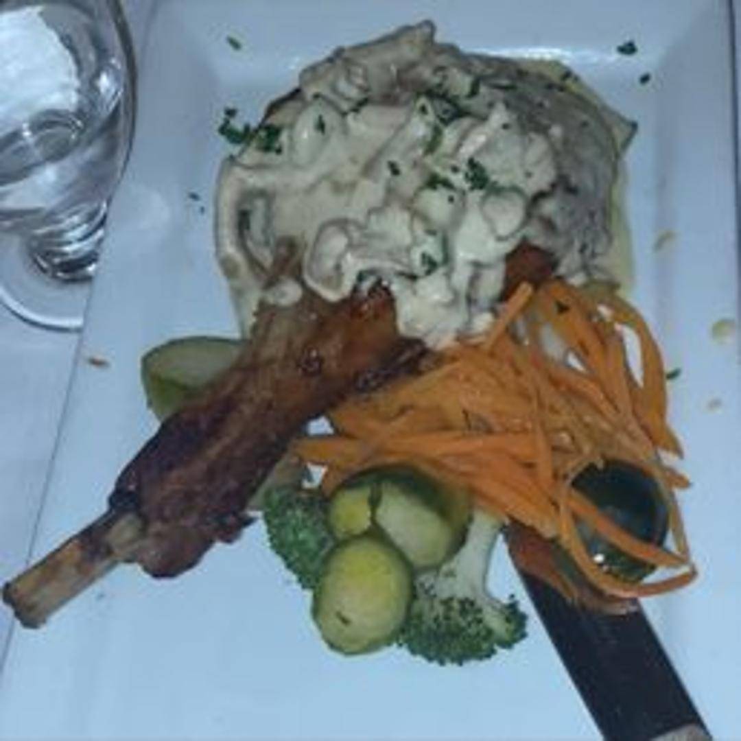 Grilled veal chop, perfectly seasoned and cooked to your preference. Served with a mushroom ragout and roasted potatoes.