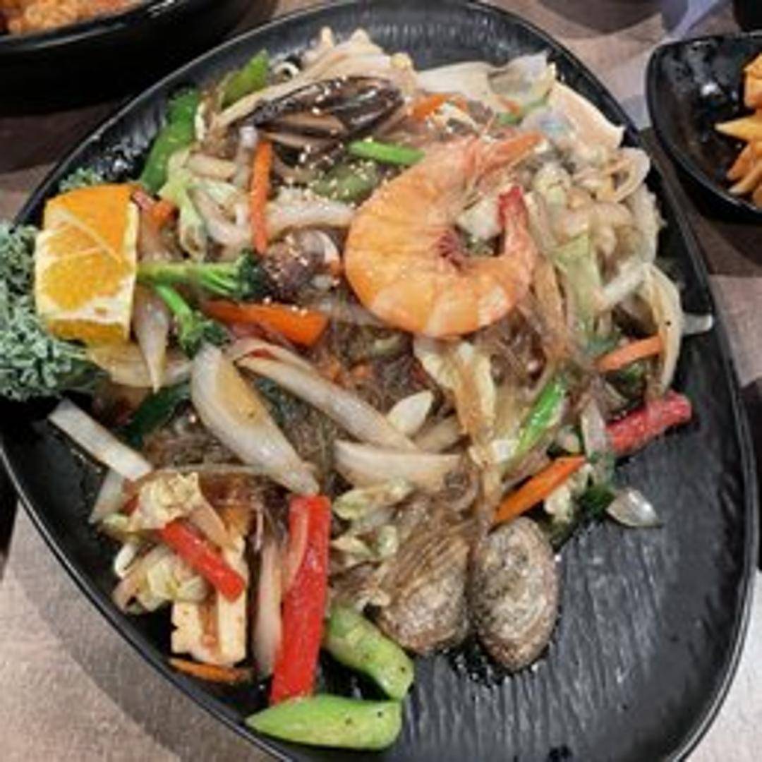 Stir-fried glass noodles with a variety of fresh seafood, colorful vegetables, and a savory soy-based sauce. A flavorful and slightly sweet noodle dish.