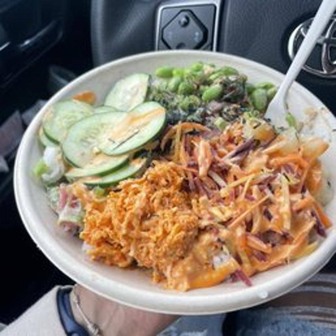 Freshly prepared sushi rice topped with marinated tuna, seaweed salad, edamame, avocado, cucumber, and a drizzle of flavorful sauce.