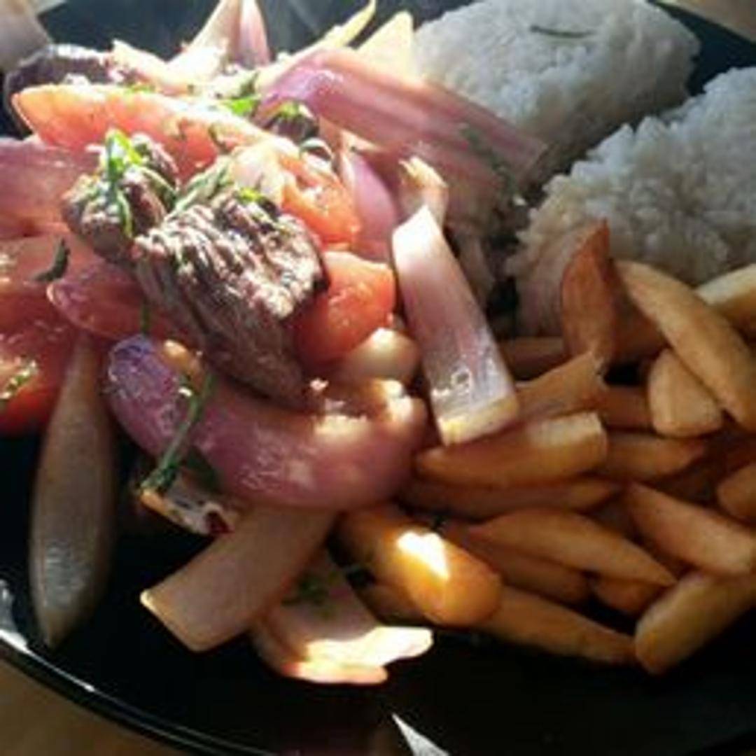 Stir-fried beef tenderloin with onions, tomatoes, and peppers, marinated in soy sauce and Peruvian spices. Served with french fries and white rice.