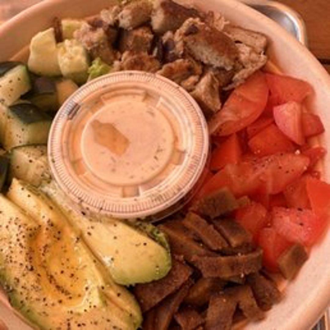 Crisp romaine lettuce topped with grilled plant-based chicken, smoky tempeh bacon, creamy avocado, juicy tomatoes, crumbled blue cheese alternative, hard-boiled egg alternative, and a tangy vinaigrette dressing.