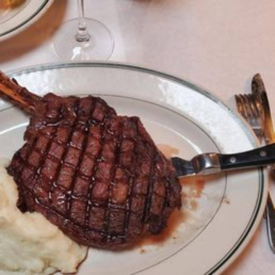 A bone-in ribeye steak, known for its generous marbling and rich, beefy flavor. The bone adds extra flavor and moisture during cooking.
