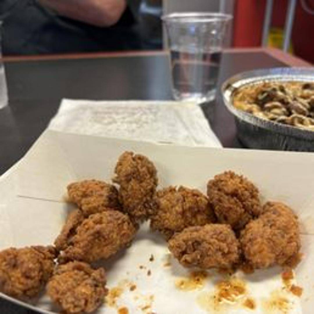 Crispy, golden-fried chicken pieces atop a bed of our creamy mac and cheese. A southern-inspired delight.