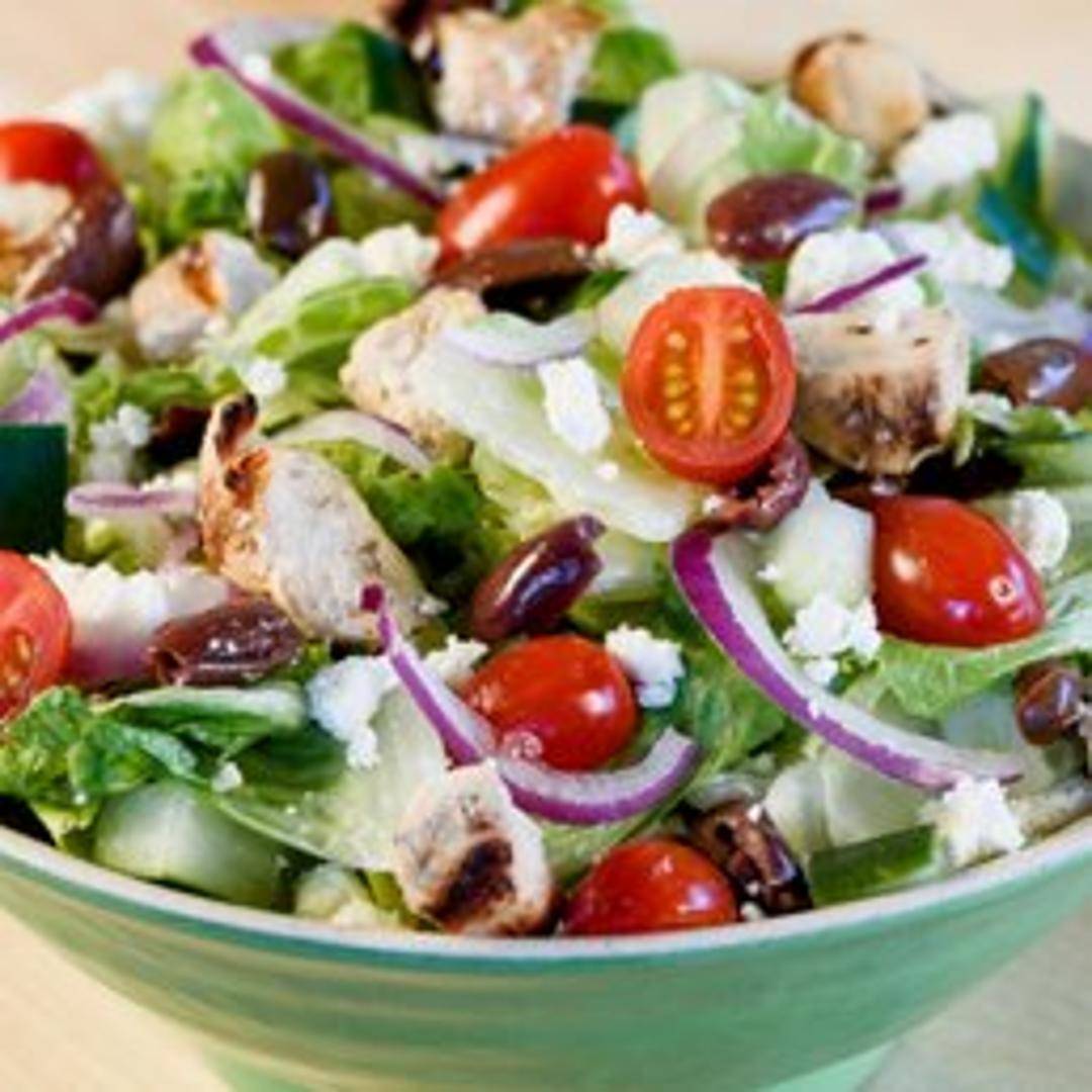 Romaine lettuce, tomatoes, cucumbers, red onion, Kalamata olives, feta cheese, and a Greek vinaigrette dressing.