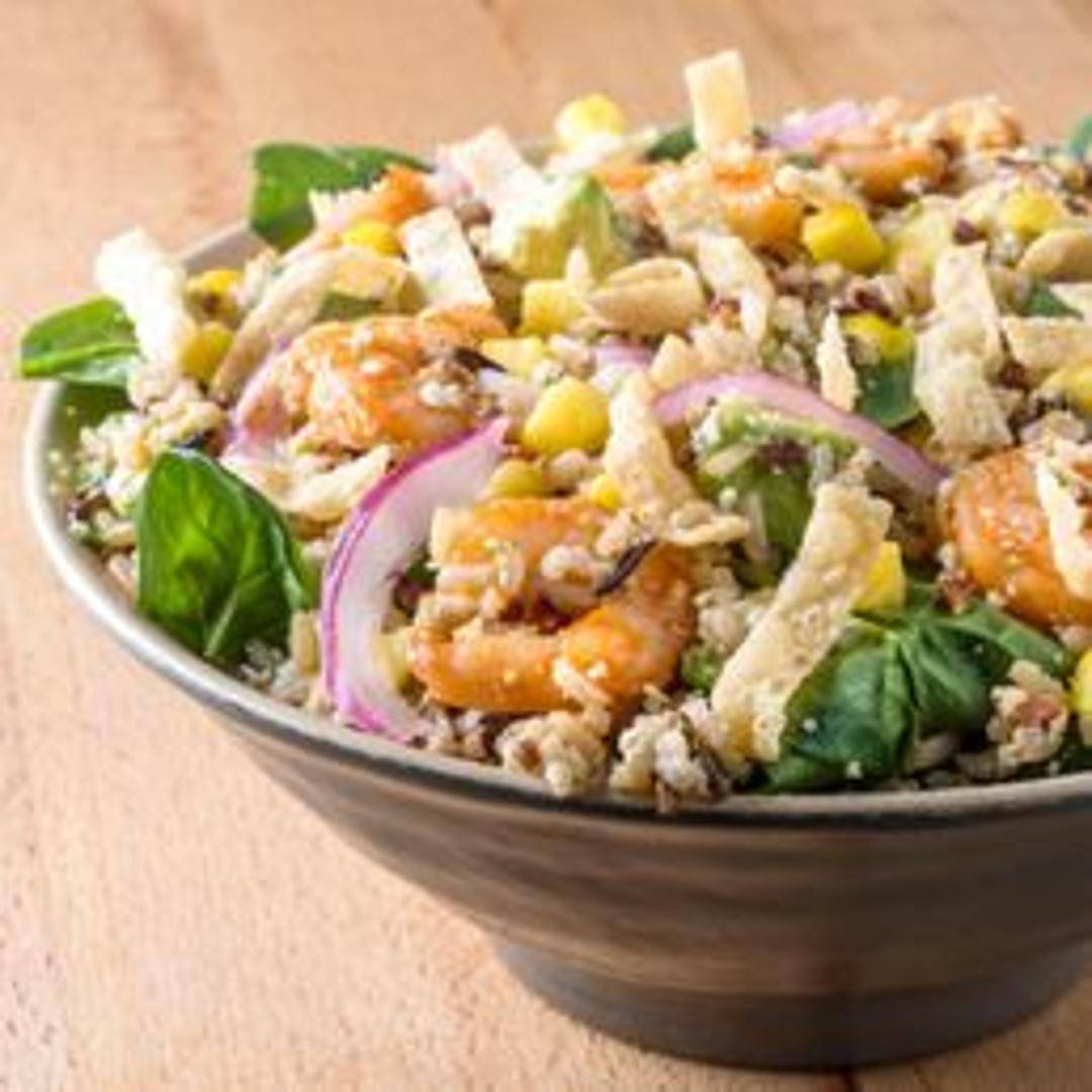 Quinoa & brown rice, blackened shrimp, black beans, corn, cotija cheese, pico de gallo, avocado, and jalapeno lime vinaigrette.