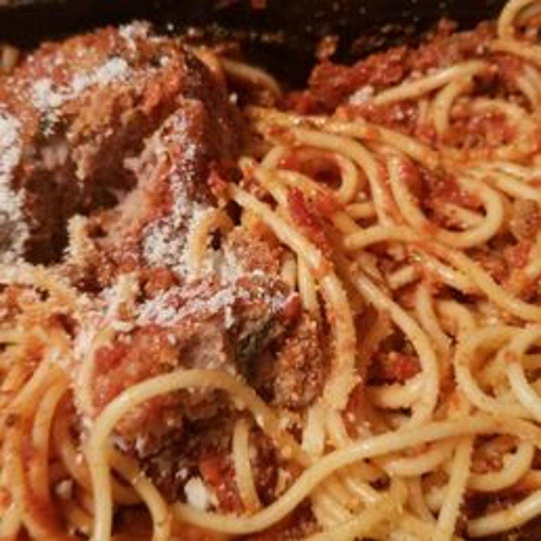 A generously sized, tender meatball made with a blend of ground meats, seasoned with Italian herbs and spices, simmered in a rich, slow-cooked marinara sauce for a classic, comforting taste of Italy.